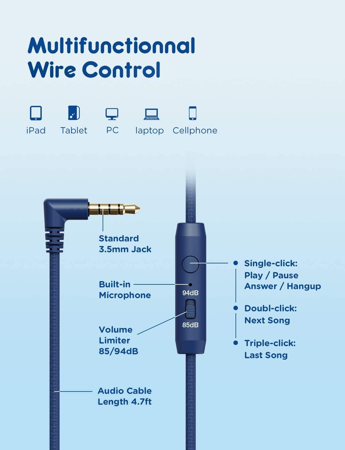 • Пълна свързаност: Тези детски слушалки с кабел са оборудвани със стандартен 3,5 мм жак и следователно са съвместими с различни устройства, включително смартфони, таблети и лаптопи. Подобреният аудио кабел с текстилна обвивка е издръжлив и нечуплив и предотвратява заплитане, за да осигури безпроблемно слушане.
