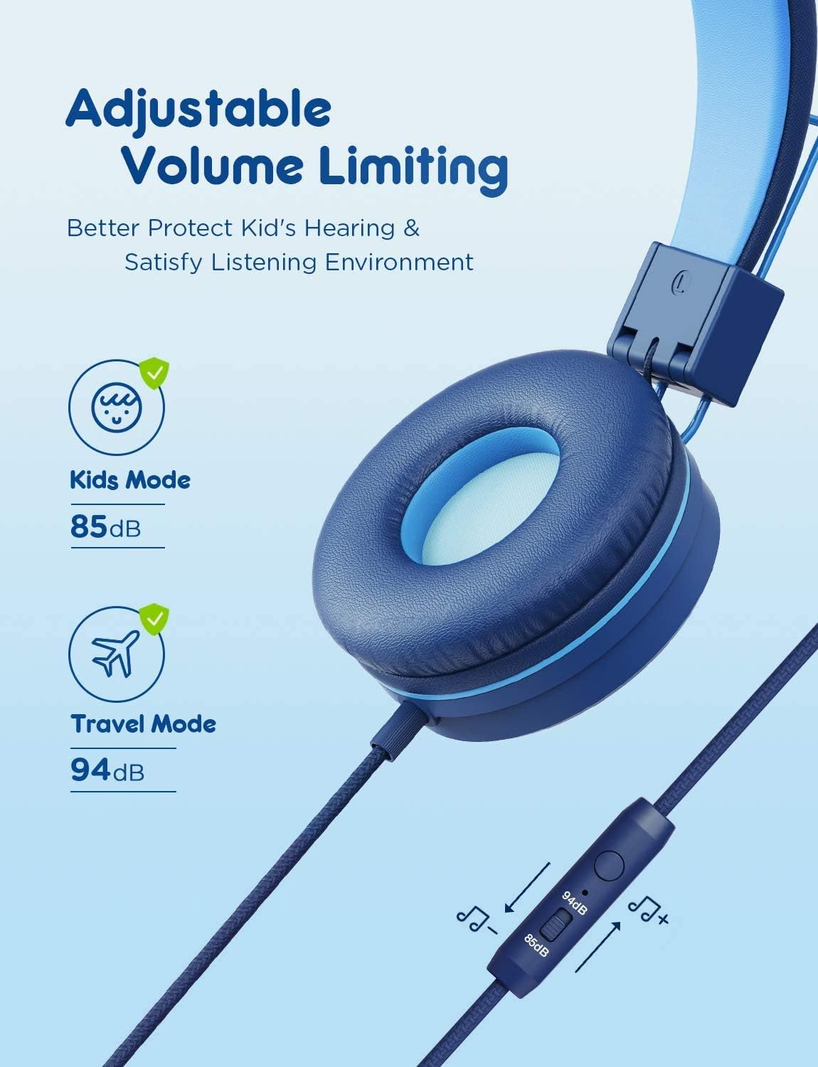 Детски слушалки - Кабелни слушалки за деца, Регулируема лента за глава, Стерео звук, Сгъваеми, Без заплитащи се кабели, 3.5 мм Aux жак, Ограничаване на силата на звука 85dB - Детски слушалки за уши, Сини