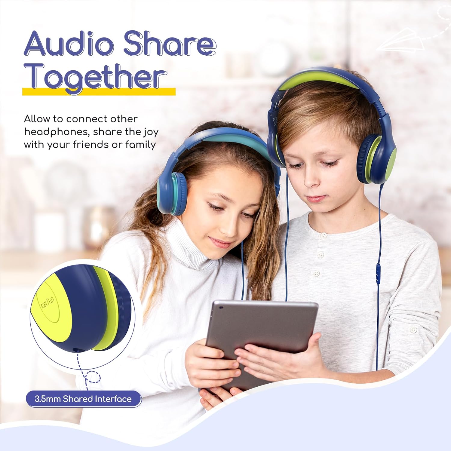 • Споделяне на звук и висока съвместимост: Детските слушалки са съвместими с всички устройства с 3,5 мм порт, като смартфони, компютри, таблети. Съвместими с iPad, Toniebox и Tiptoi химикалки. Функцията за споделяне на звук позволява на децата да се наслаждават на видеоклипове и музика заедно с приятели или семейство и да споделят радост.