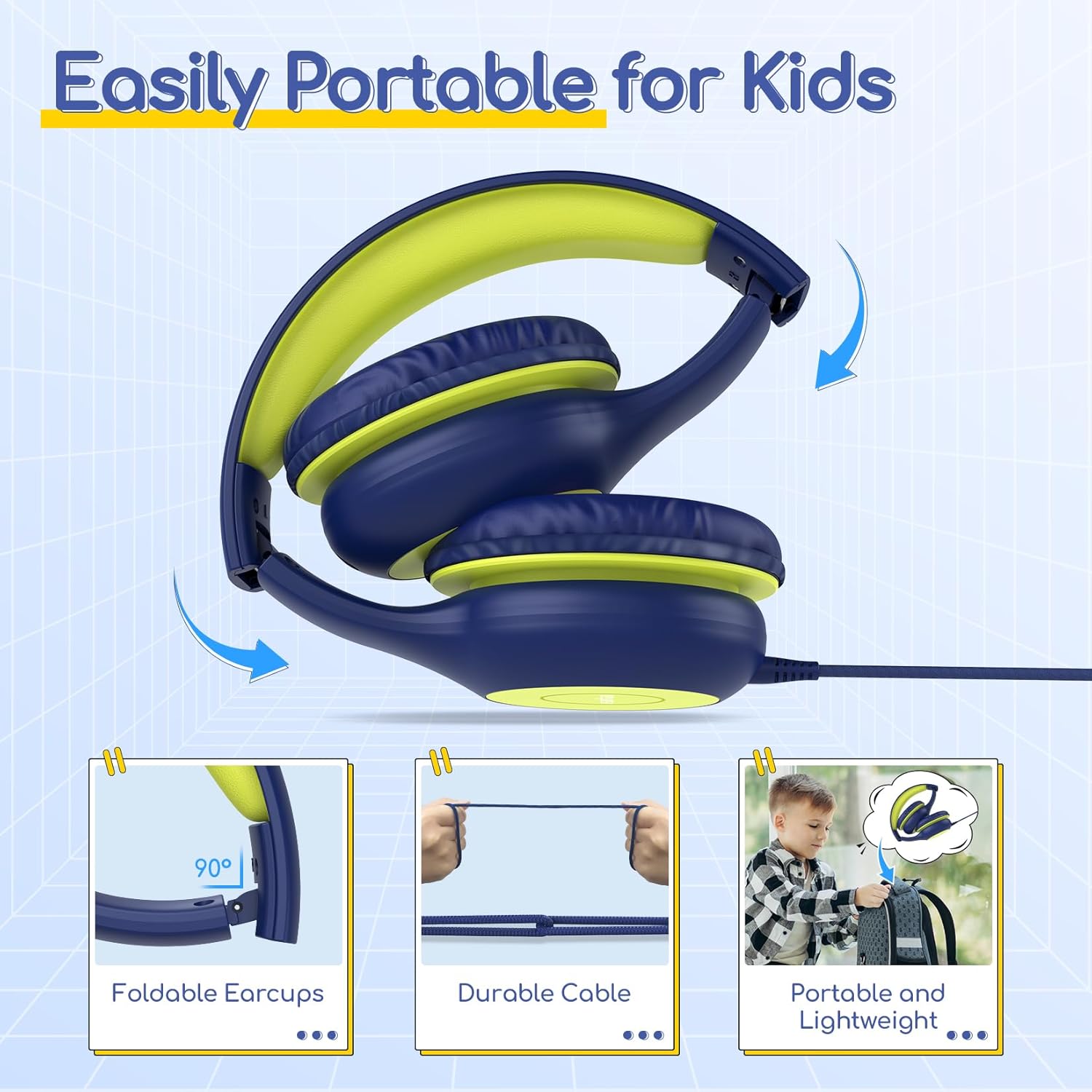 • Сгъваем и регулируем дизайн: Детските слушалки могат лесно да се сгъват и съхраняват в раница или куфар. Те се адаптират към различни типове глава и коса и са подходящи за деца на възраст от 3 до 13 години. С тегло от 198 грама, те са леки и удобни за по-дълго носене.