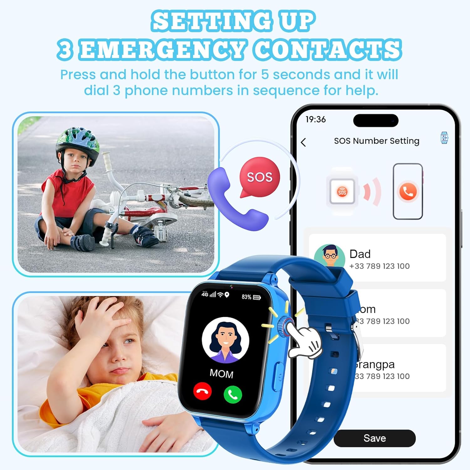 • Детски смарт часовник с GPS и 4G разговори: Този смарт часовник за деца е оборудван с GPS, видео разговори, гласов чат, SOS, режим на клас, SMS, WiFi, камера, крачкомер, будилник, хронометър, игри и други функции и е перфектен подарък за момчета и момичета 4-12 години за рожден ден, празници, фестивали, Великден, Ден на благодарността и Коледа.
