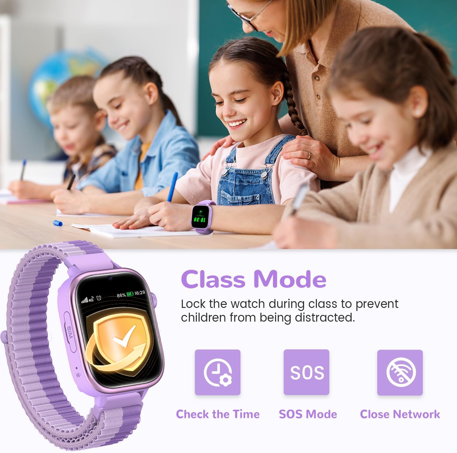 • Училищен режим без смущения: Интелигентен училищен режим, активиран по време на уроци - детският смарт часовник с GPS и SIM карта автоматично заключва екрана. Запазват се само показването на времето и SOS функцията, което ефективно предотвратява разсейването. Детският часовник за момче/момиче автоматично отхвърля всички обаждания от непознати номера и позволява само обаждания от контакти в белия списък, като например родители, за да осигури чиста и безопасна комуникационна среда за детето.