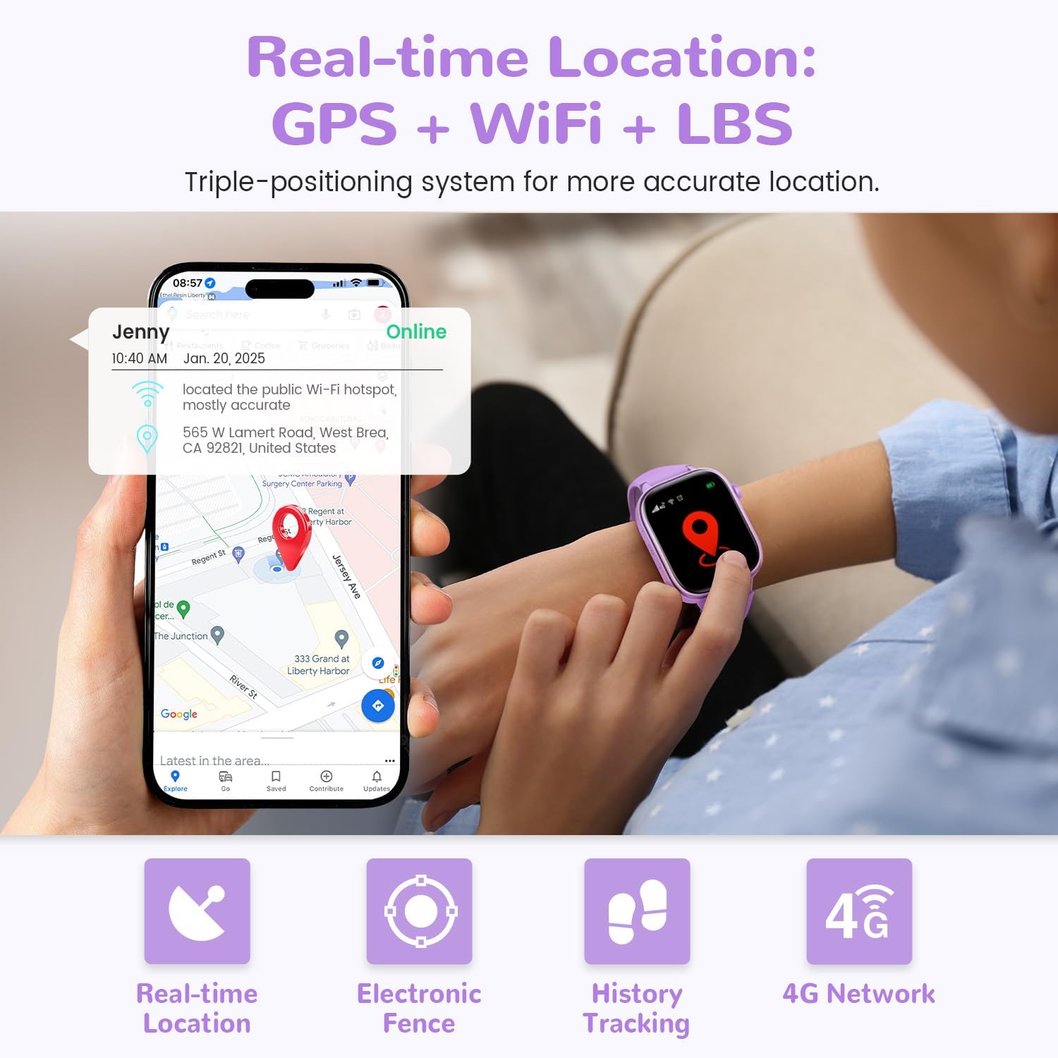 • GPS и SOS повиквания в реално време: Детският смарт часовник с GPS и телефон използва тройна технология за проследяване (GPS + WiFi + LBS), за да показва точно местоположението на детето на картата в реално време. Можете да настроите „електронна ограда“ и да получавате незабавно известие, когато детето напусне тази зона. В случай на спешност часовникът автоматично избира 3 аварийни контакта един след друг чрез продължително натискане на SOS бутона, като по този начин напълно защитава безопасността на детето.