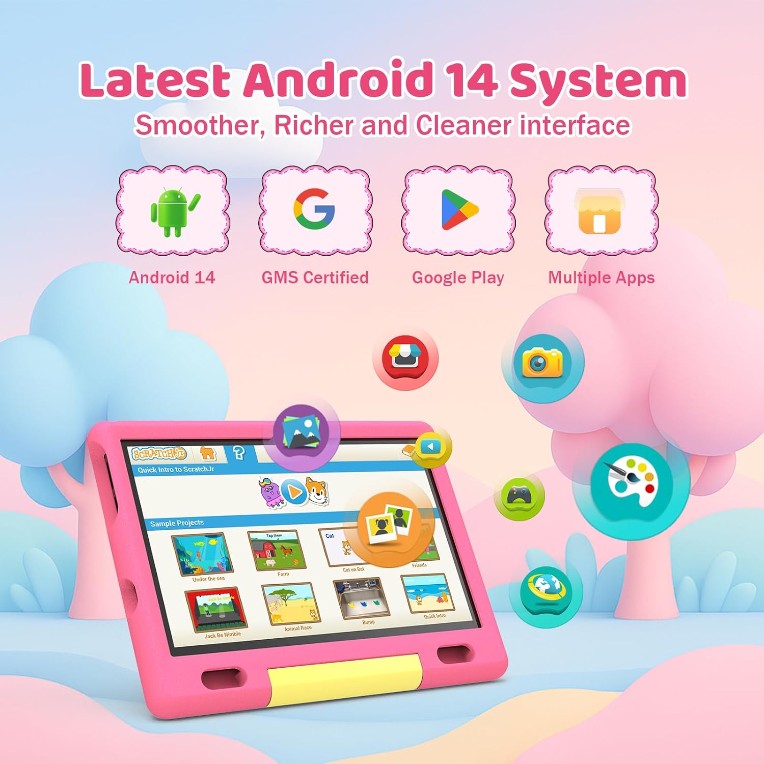 • ????【Таблет с Android 14 за деца】10-инчовият детски таблет е с актуализирана операционна система Android 14, която осигурява по-плавно потребителско изживяване и намалява консумацията на енергия. Android 14 също така подобрява поверителността, включително контрол върху разрешенията за приложения и различни други настройки за лични данни. Детският таблет е оборудван и с 2.0 GHz осемядрен процесор, който е с 40% по-бърз от конвенционалните процесори, базирани на честота. Кажете сбогом на забавянето и здравей на безпроблемното многозадачност.