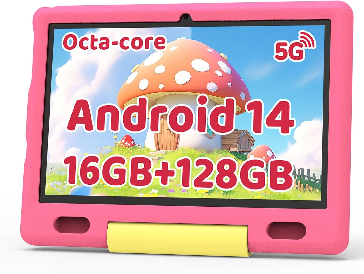 Детски таблет Ainmel 10-инчов осемядрен Android 14 таблет за деца, 16GB + 128GB (1TB TF), заключване за деца, WiFi 6/Bluetooth 5.3, Widevine L1 с корпус, защитен от деца - розов