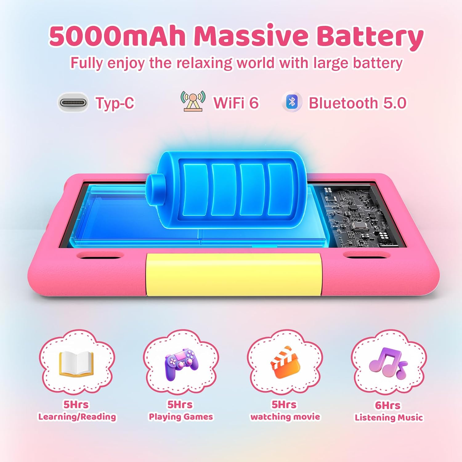 • ????【HD дисплей + WiFi 6 + Bluetooth 5.3】Детският таблет е с HD IPS сензорен екран с резолюция 1280x800, предлагащ отлично зрително изживяване от всички ъгли. Таблетът за деца използва и WiFi технология от 6-то поколение и поддържа 5G WiFi, което ви позволява да сърфирате в интернет бързо и свободно, осигурявайки по-добра мрежова връзка с по-ниска латентност, по-силен сигнал и по-високи скорости.