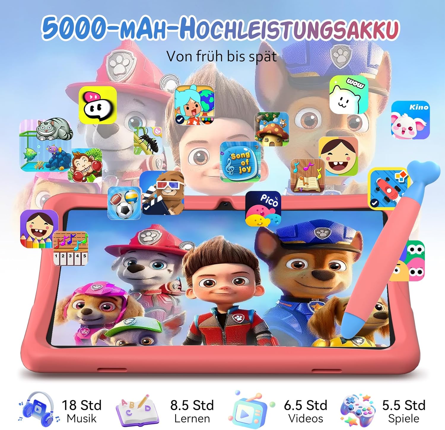 • ????【Батерия 5000 mAh + две камери】Детският таблет TABWEE K10 с батерия 5000 mAh позволява игра и учене през целия ден. Като детски таблет, той разполага с две камери и HD видео разговори, което позволява на родителите да наблюдават растежа на децата си.