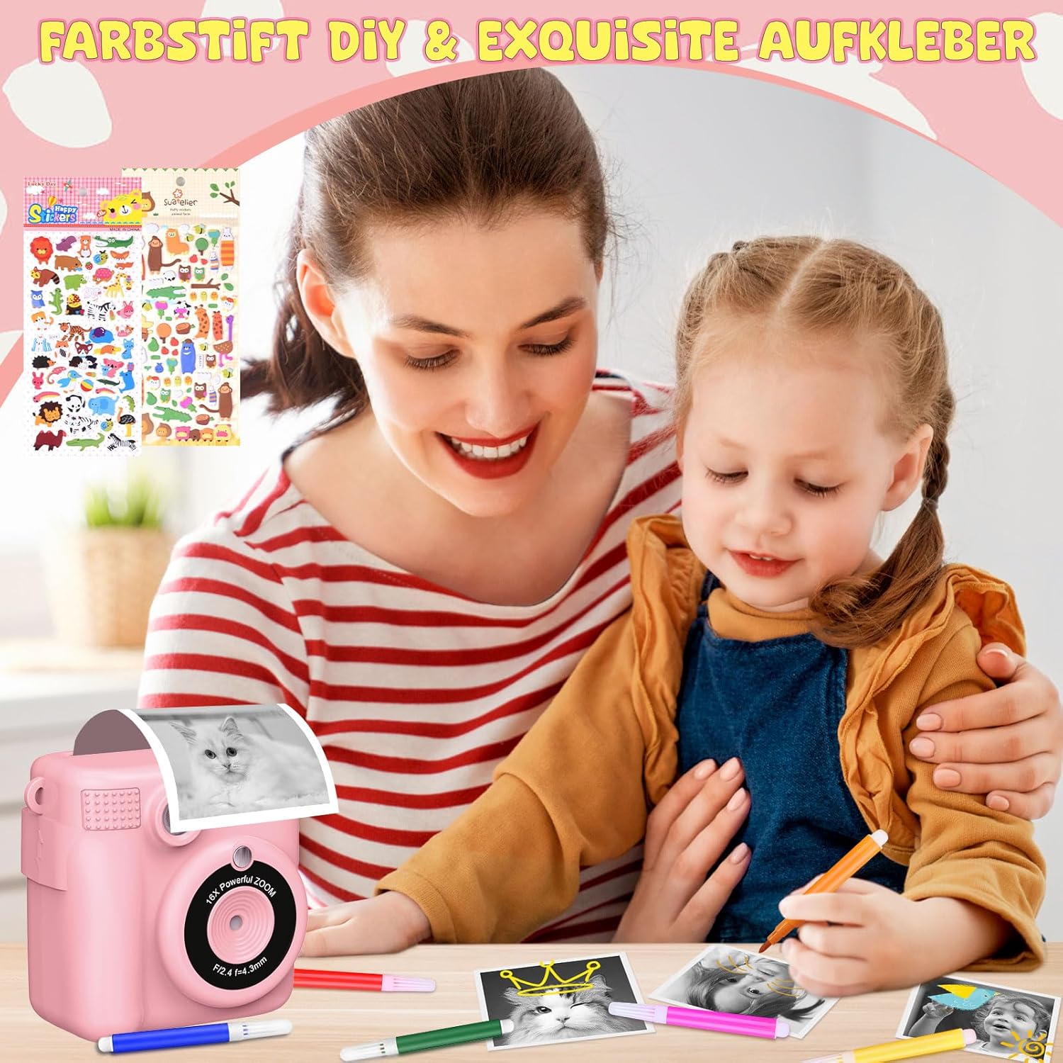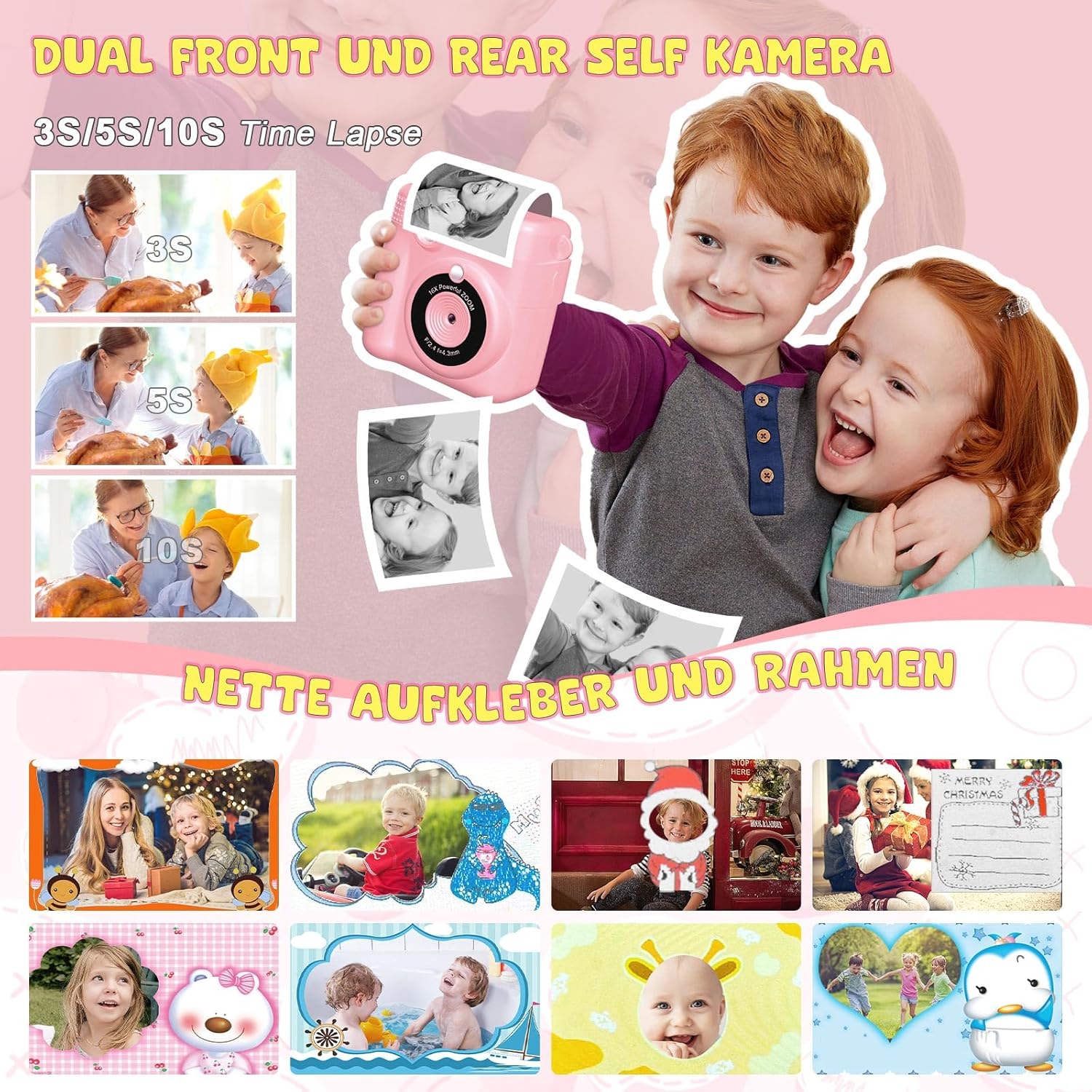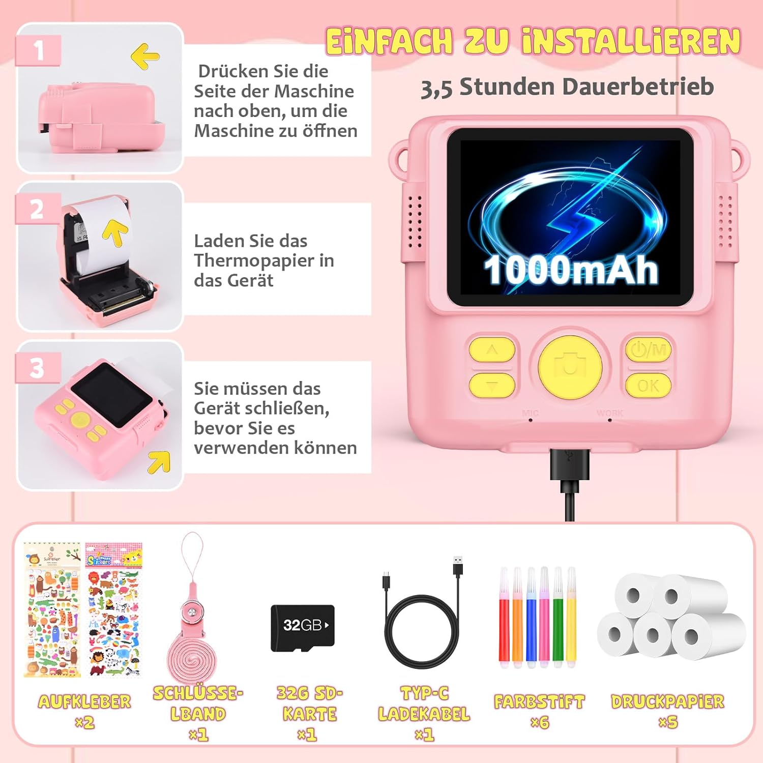 • Детски фотоапарат за моментално заснемане: изработен от висококачествен ABS материал, устойчив на удар, нетоксичен и екологичен, чудесен подарък за деца. Включената ролка термохартия позволява до 80 разпечатки и е с възможност за многократно зареждане. Цифров фотоапарат за деца на възраст 3-12 години. Това е категория детски фотоапарат играчки (не е висок клас фотоапарат).