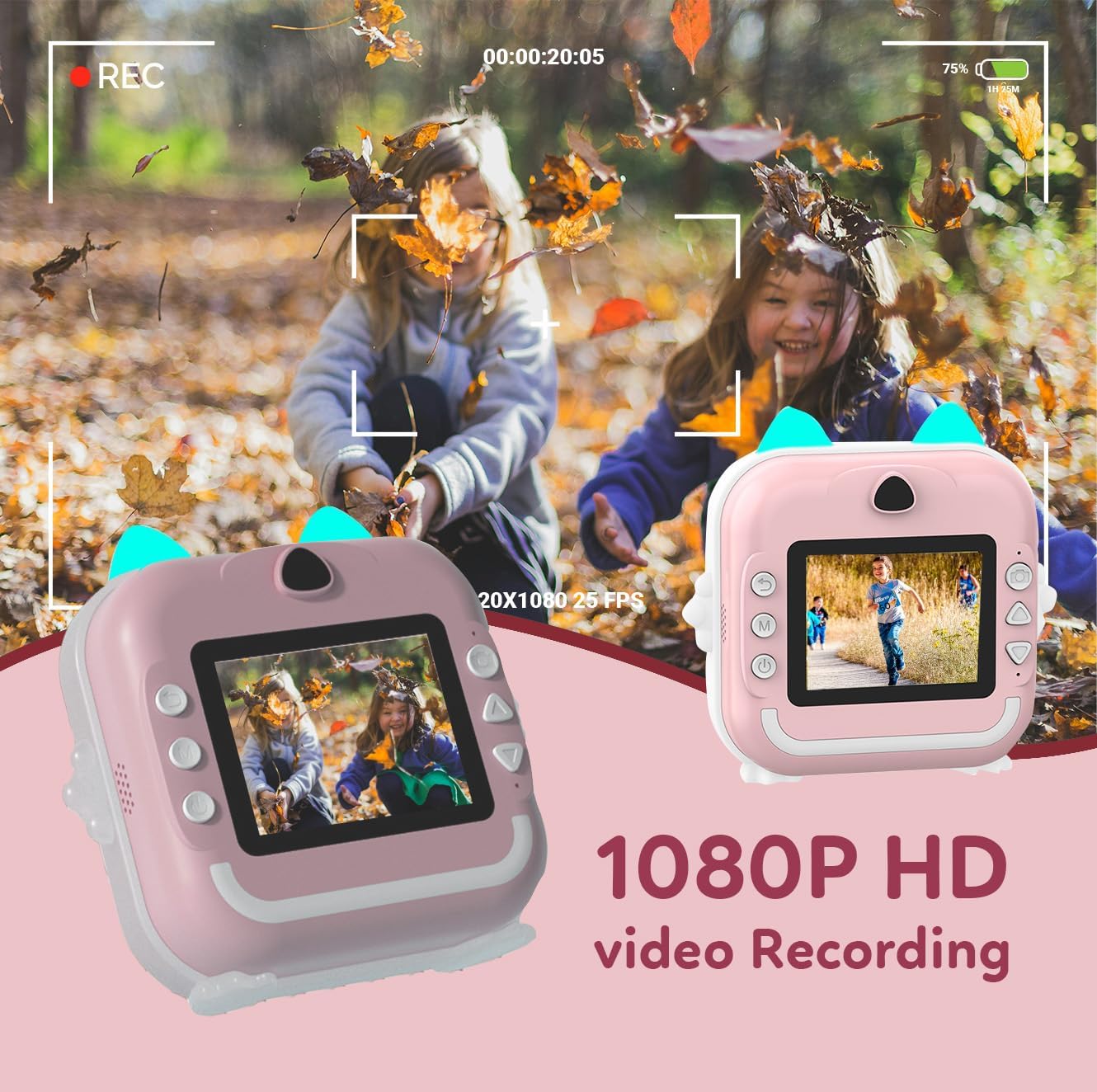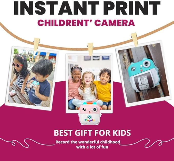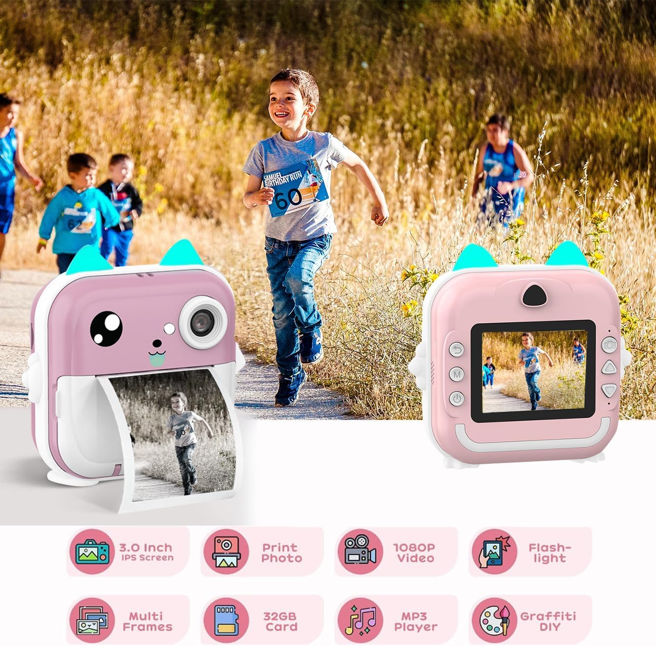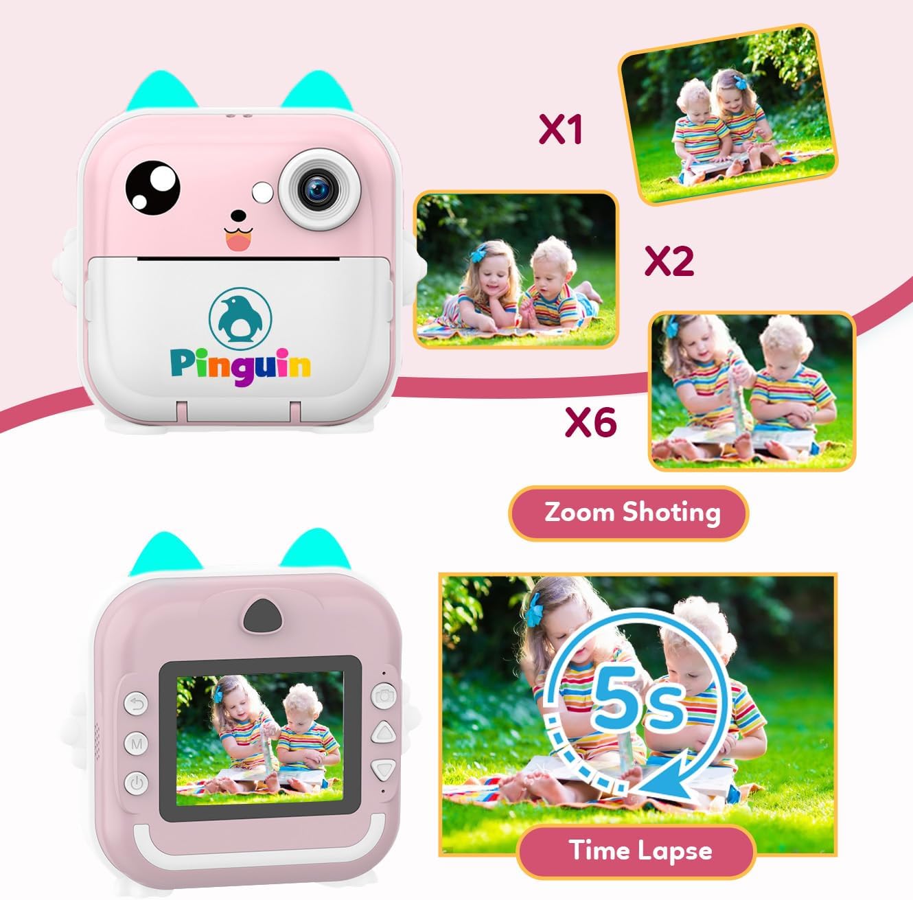 • Детски фотоапарат за моментално печатане: този дигитален детски фотоапарат предлага възможност за незабавно отпечатване на детски снимки. Специално проектиран за деца на възраст от 3 до 12 години, този детски фотоапарат ви позволява лесно да отпечатвате черно-бели снимки в реално време, без мастило. Включени са три ролки хартия за печат (едната ролка е вече инсталирана във фотоапарата), така че децата могат веднага да изпитат радостта от моменталното печатане.