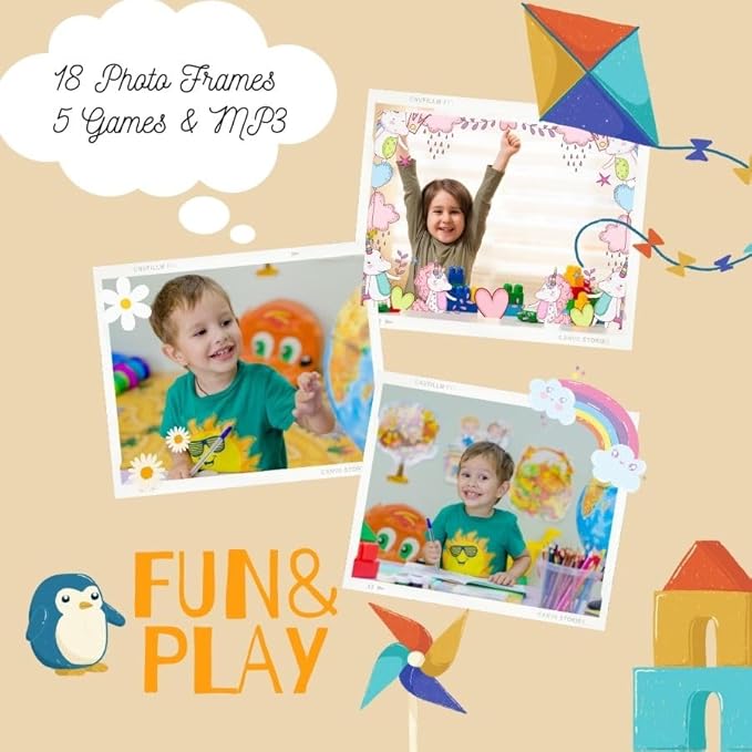 • Многофункционални функции и високо ниво на забавление: този фотоапарат за моментални снимки за деца предлага функции като видеозапис, фотография с ускорен кадър, непрекъснато снимане, светкавица и възпроизвеждане на MP3. С таймер снимки, непрекъснати снимки и забавни рамки за картини, децата могат да развихрят своята креативност.