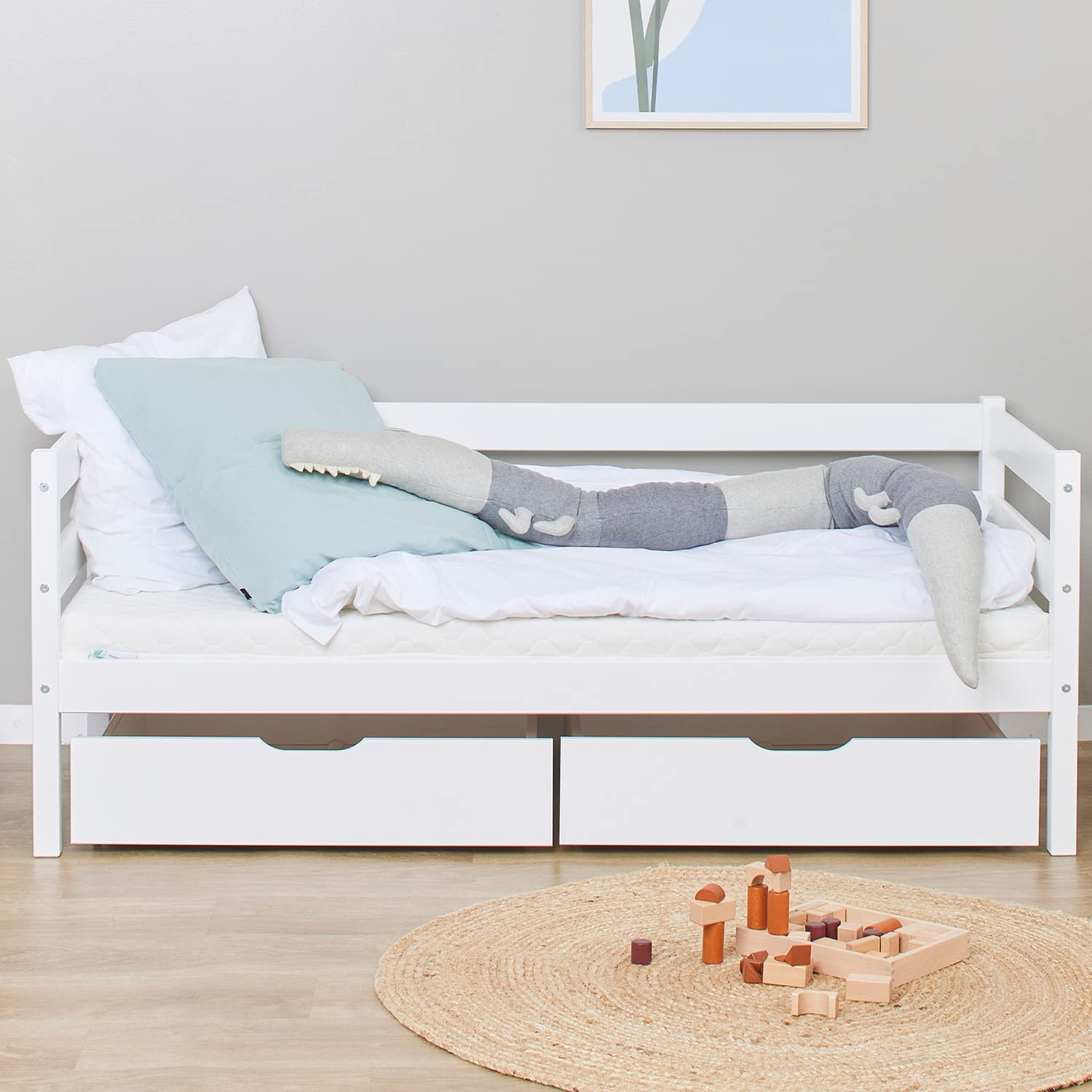 Детско легло Hoppekids ECO Comfort, Дървено, Размер 70х160см, Защита срещу падане, Чекмеджета, Бяло