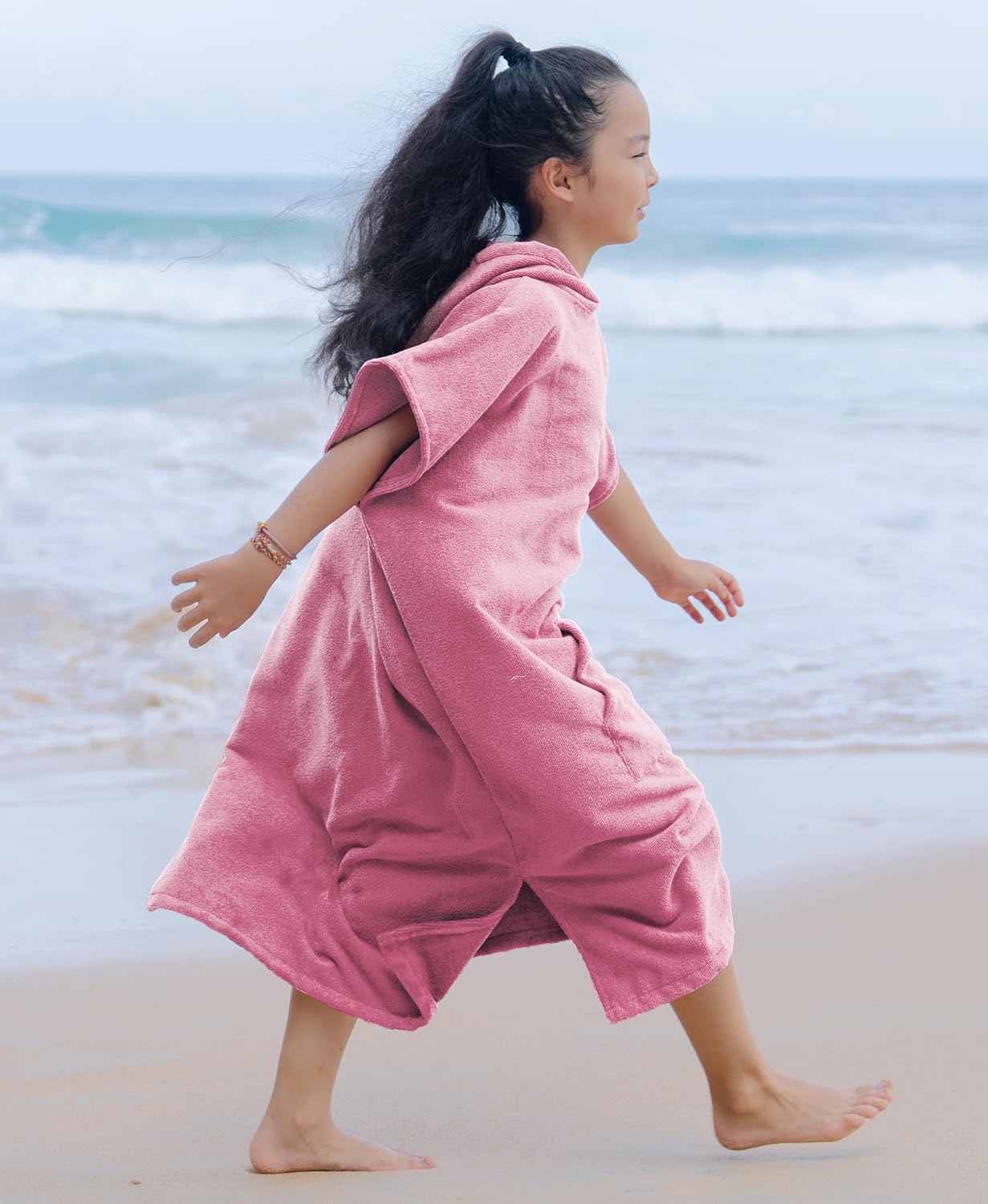 Wir haben Schlitze an den Seiten des Handtuchmantels, damit Kinder sich ohne einengende Beine bewegen können.