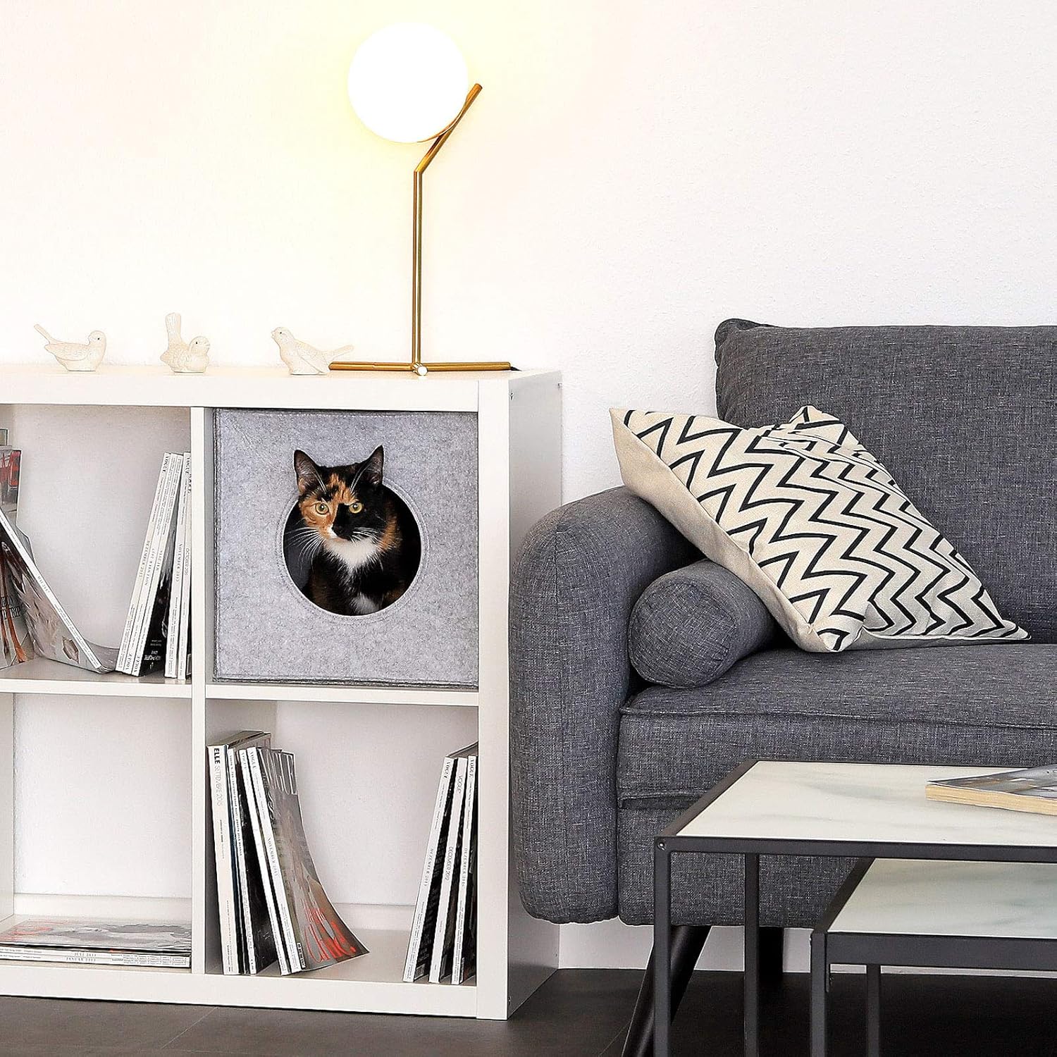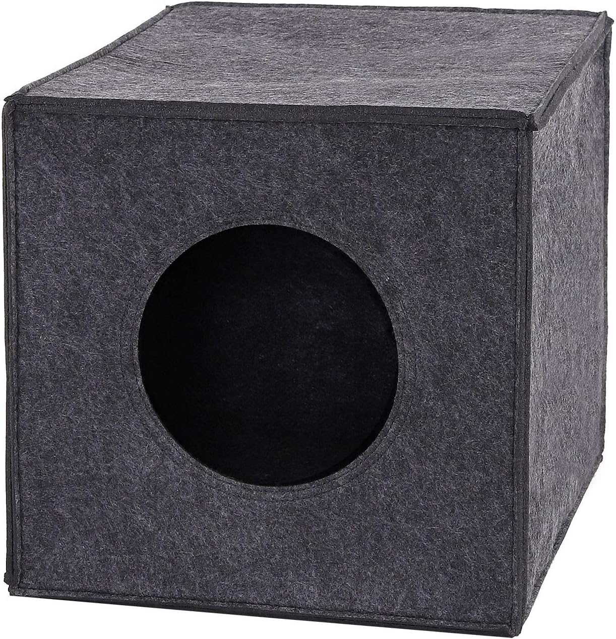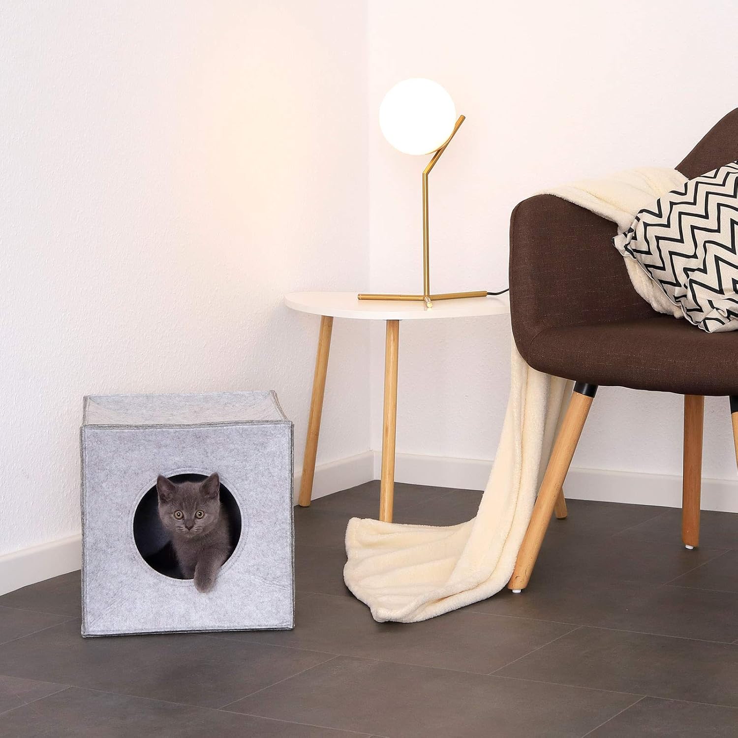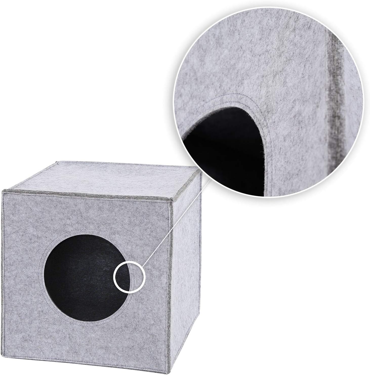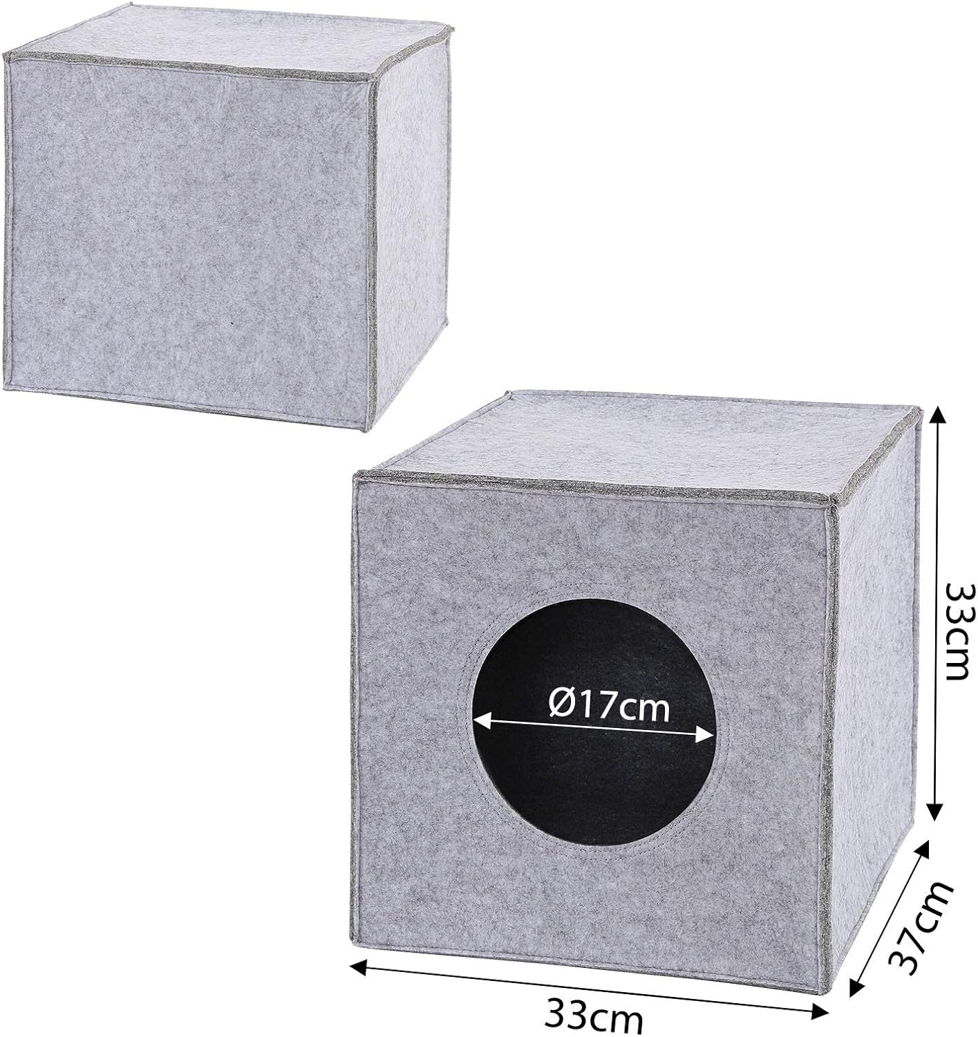 Кубообразната пухкава пещера, изработена от здрав филц, има вход с диаметър 17 см и дебелина на стената 5 мм, размерите са 33 x 37 x 33 см. Филцовата пещера е подходяща за стандартни рафтове, като например рафтовете Ikea Kallax или Ikea Expedit. Също така е свободностояща и предлага уютно място за спане. Предлагаме тази филцова куба в цветовете светло сиво и тъмно сиво, с или без мека възглавница, чийто калъф може да се сваля за почистване.