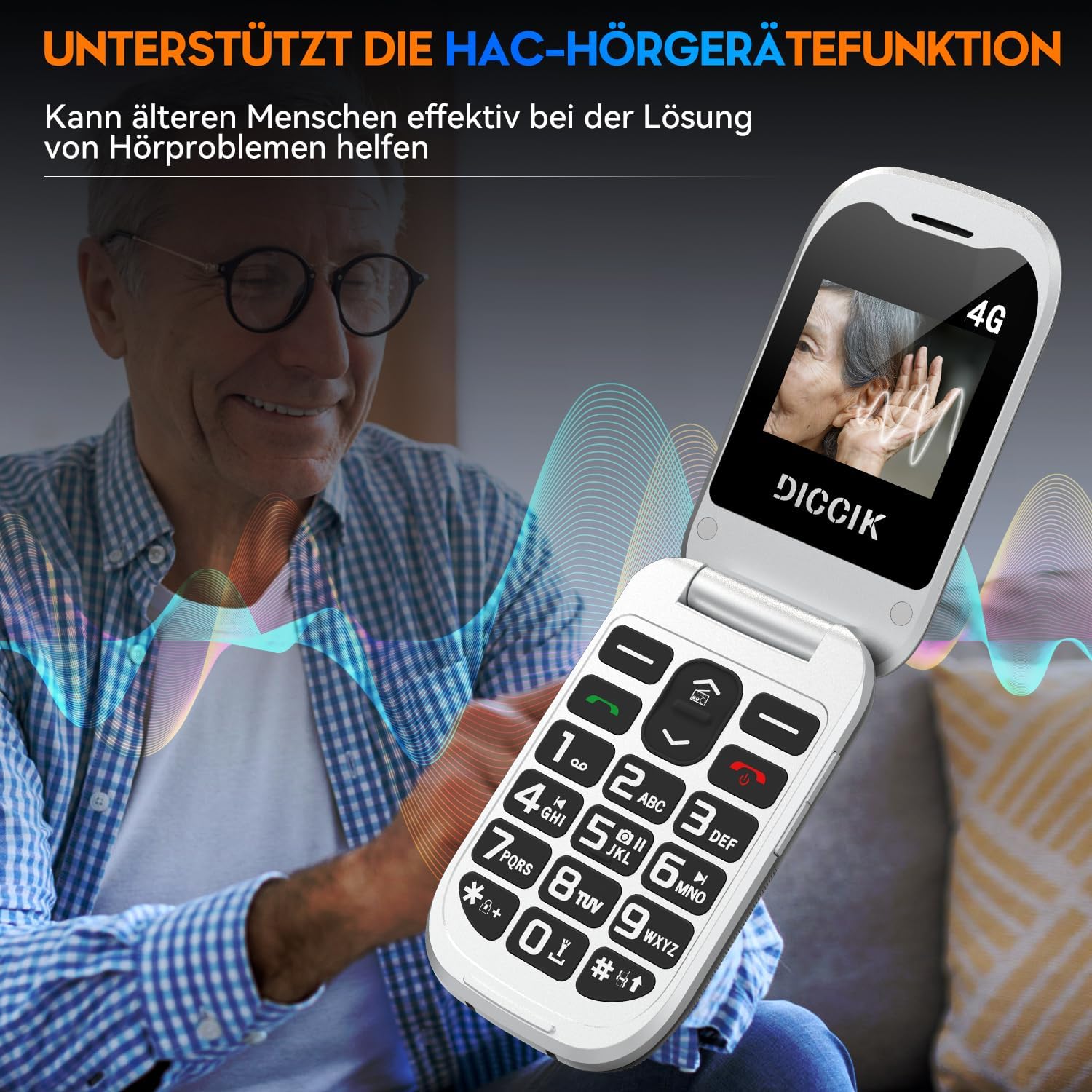 • Функция за слухов апарат HAC Мобилният телефон DICCIK K01 е мобилен телефон, специално проектиран за възрастни хора и деца. Той има функция за слухов апарат HAC, която може да помогне по-добре на възрастните хора, страдащи от лоша комуникация поради слухови увреждания.