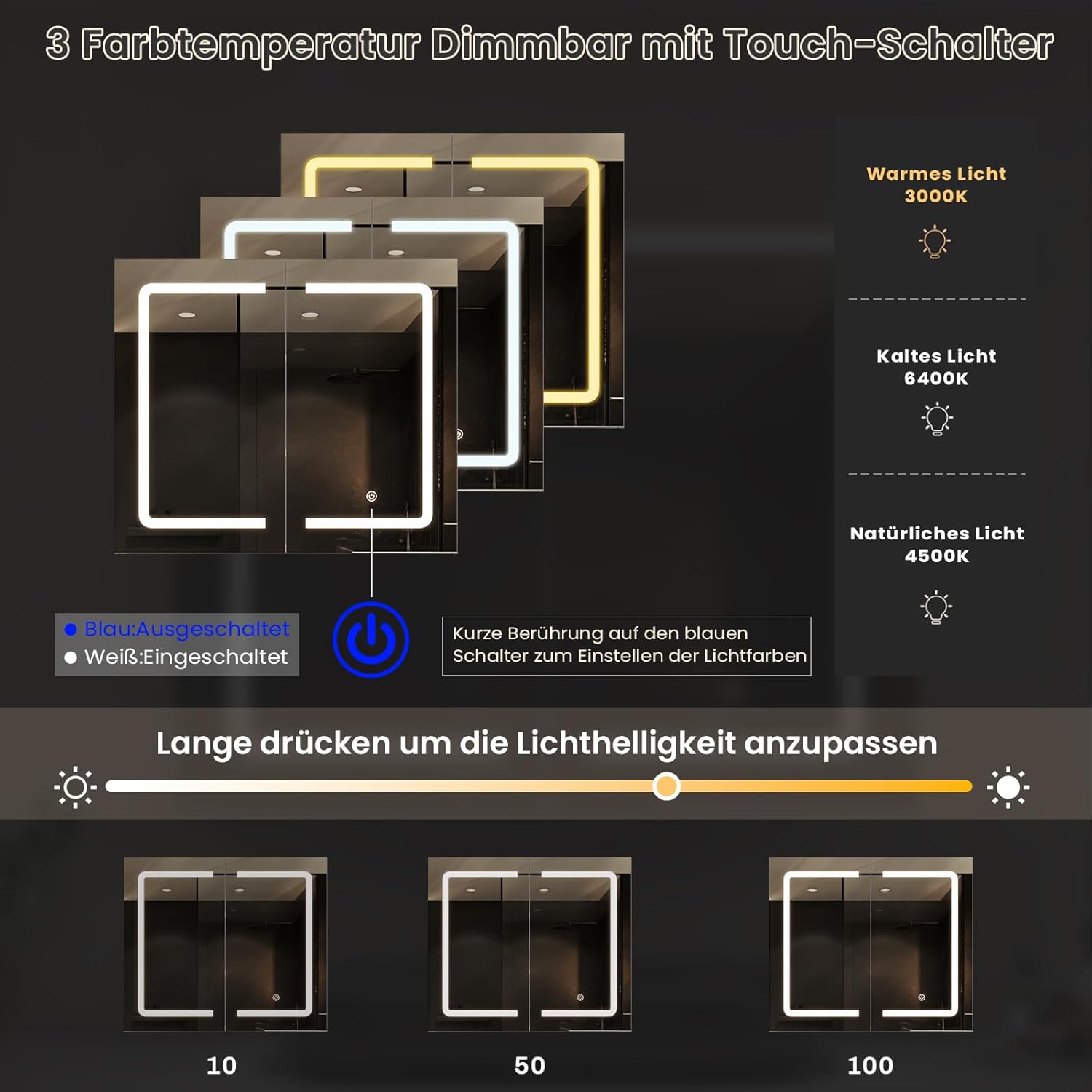 • С LED осветление: Висящ шкаф за баня DICTAC с огледало, ярка и естествена, регулируема яркост и три цвята на светлината: студена, топла, естествена светлина, осигурява 3 режима на осветление от 3000 K до 6500 K. Просто докоснете синия превключвател на огледалото, за да включите LED светлините. Чрез кратко натискане може да се превключва между тези три вида светлина, а с продължително натискане - за регулиране на яркостта на светлината. Синият осветен бутон е ясно видим дори през нощта.