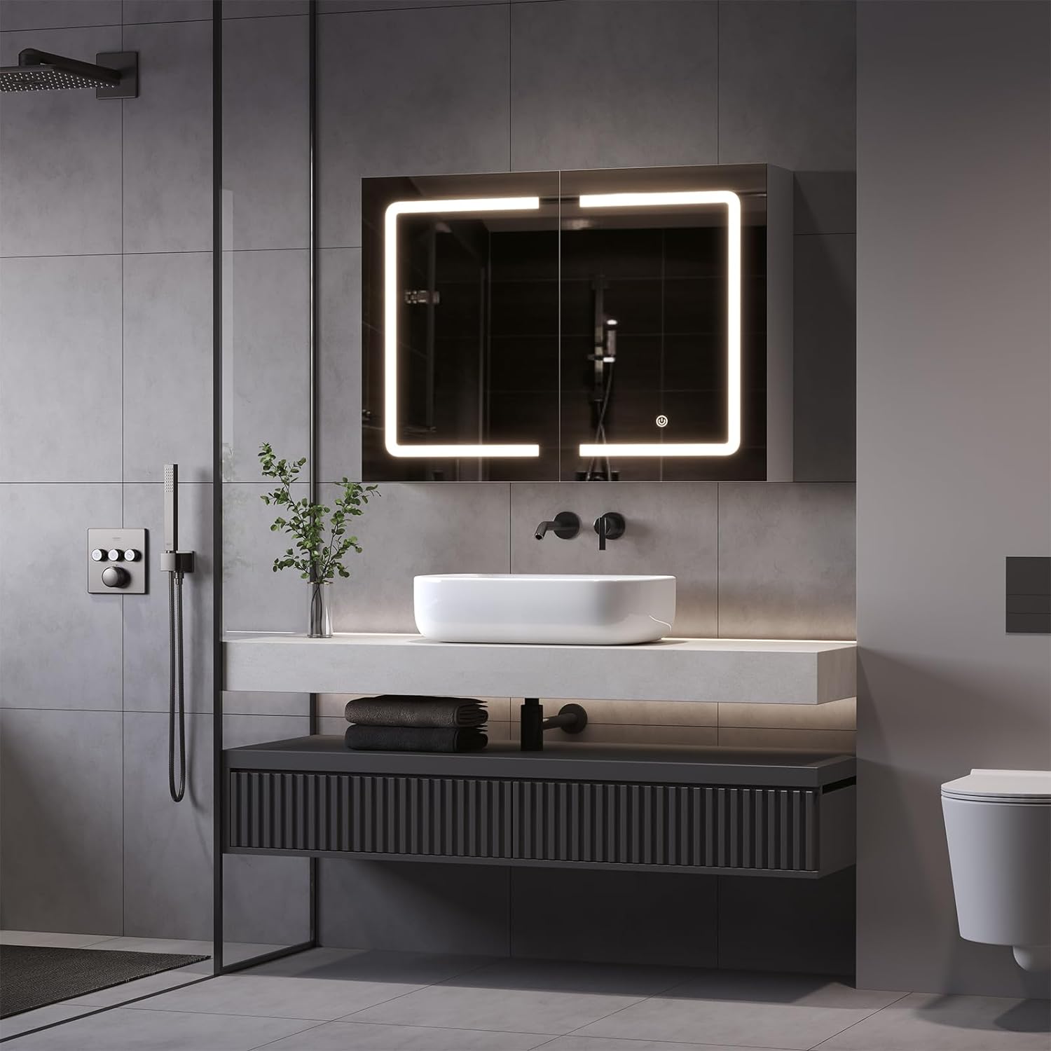 • Стилен и многофункционален: Шкаф за огледало за баня DICTAC с осветление, използва стенен дизайн, огледалото за баня с ширина 80 см обикновено се монтира директно над мивката, не е необходимо да заема място на пода и предлага голямо пространство за съхранение. Могат да се комбинират с всеки стил на декорация и са идеални за баня, кухня, хол, спалня, входно антре и др.