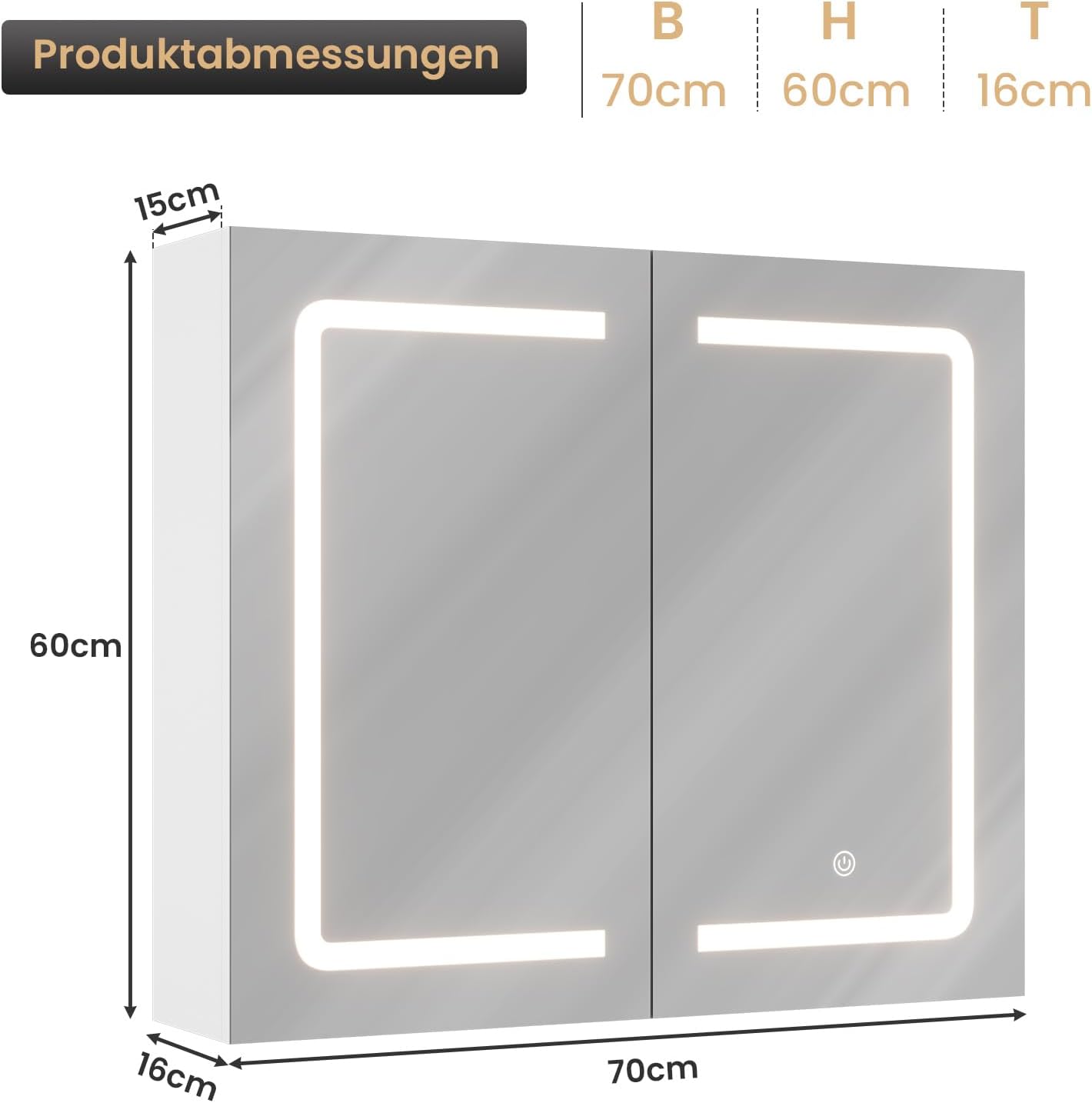 DICTAC Шкаф за баня с огледало с осветление и контакт, двойна врата, 70 x 16 x 60 см, Шкаф за баня с огледало, стенен шкаф, огледало за баня, 3 цветни температури, димируем, бял