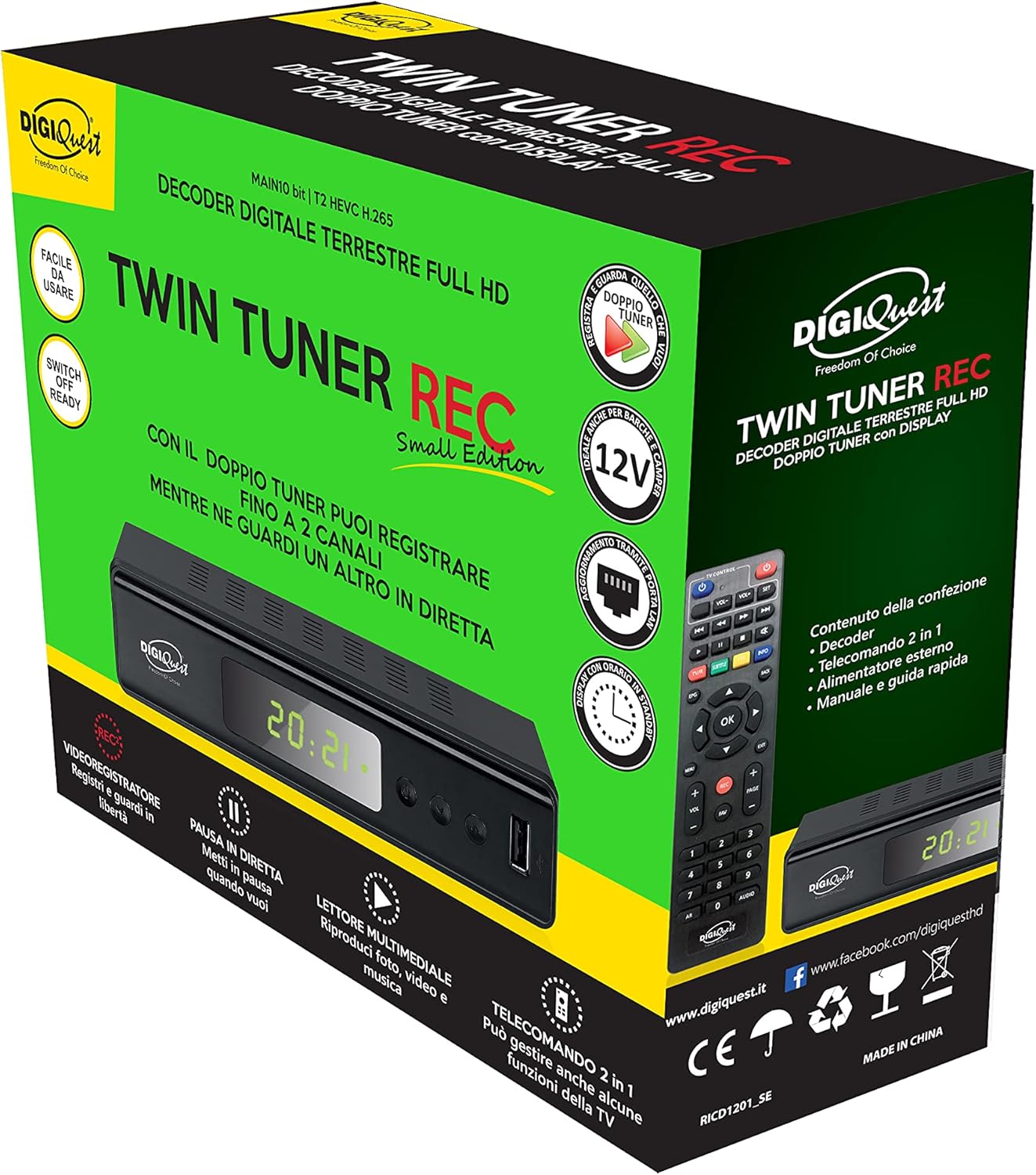 Full HD ефирен цифров приемник, 10-битов чипсет, ефирен двоен тунер с независим двоен тунер, който не изисква втори кабел. Функционира и като медиен плейър за гледане на филми, слушане на музика или разглеждане на снимки на вашия телевизор. Функцията за времево изместване (директна пауза) ви позволява да поставите на пауза програма и след това да я възобновите да гледате по-късно. Дистанционното управление 2 в 1 ви позволява да управлявате основните функции на телевизора. 12V захранване позволява употреба в движение (кемпери, лодки).