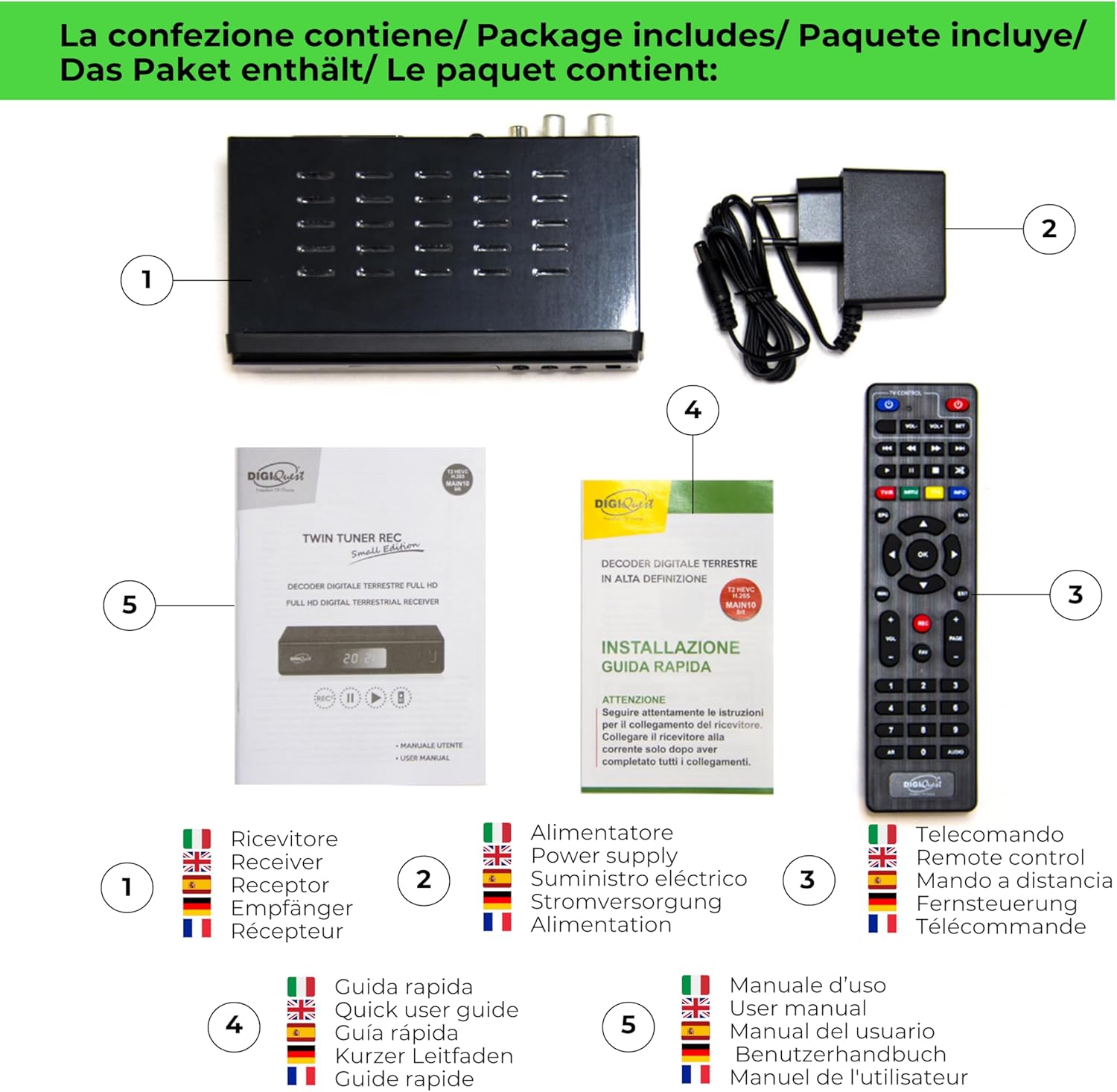 Дистанционно управление 2 в 1 Външно захранване: Вход 100-240V~50/60Hz Изход 12V 1A Ръководство Италиански/Английски Ръководство за бърз старт