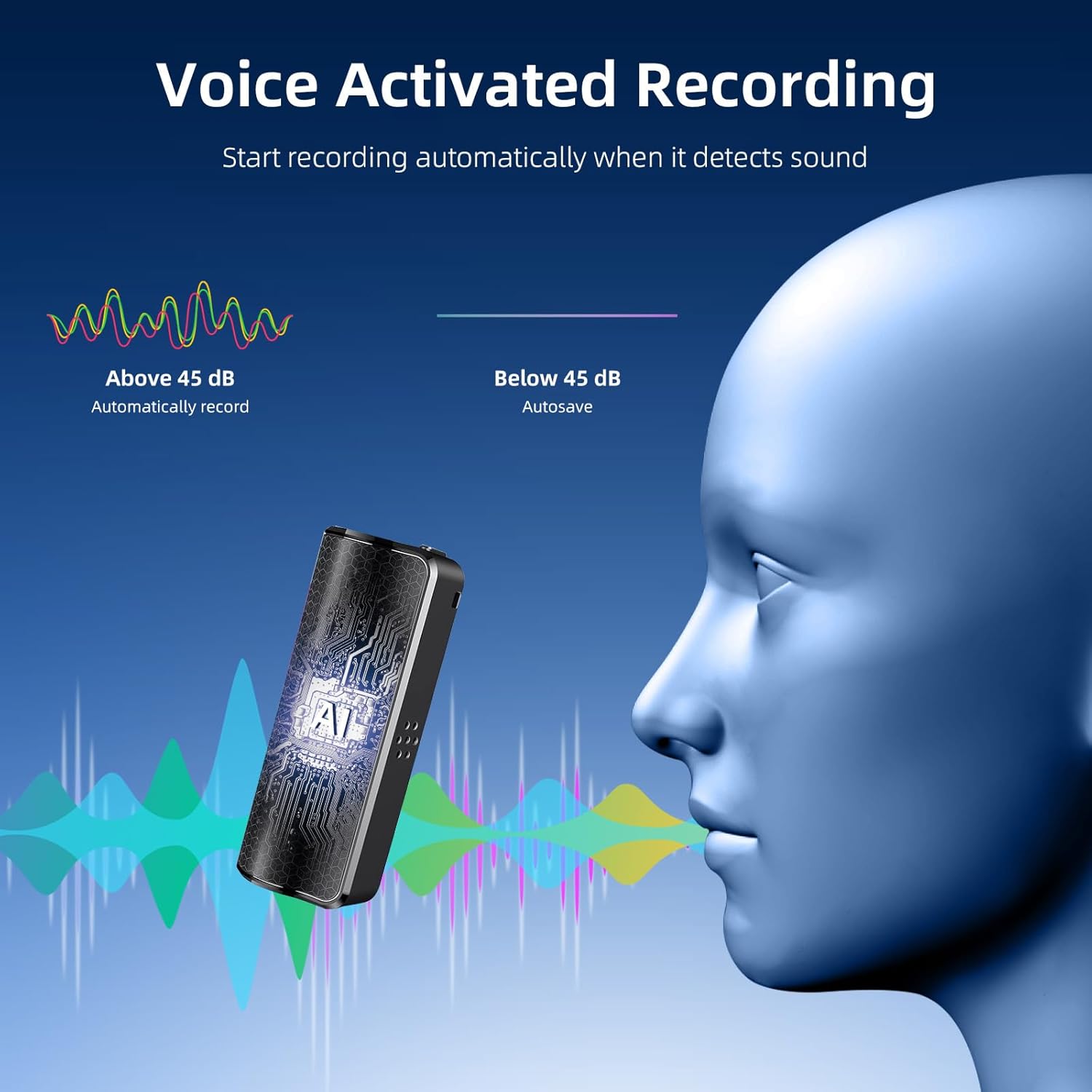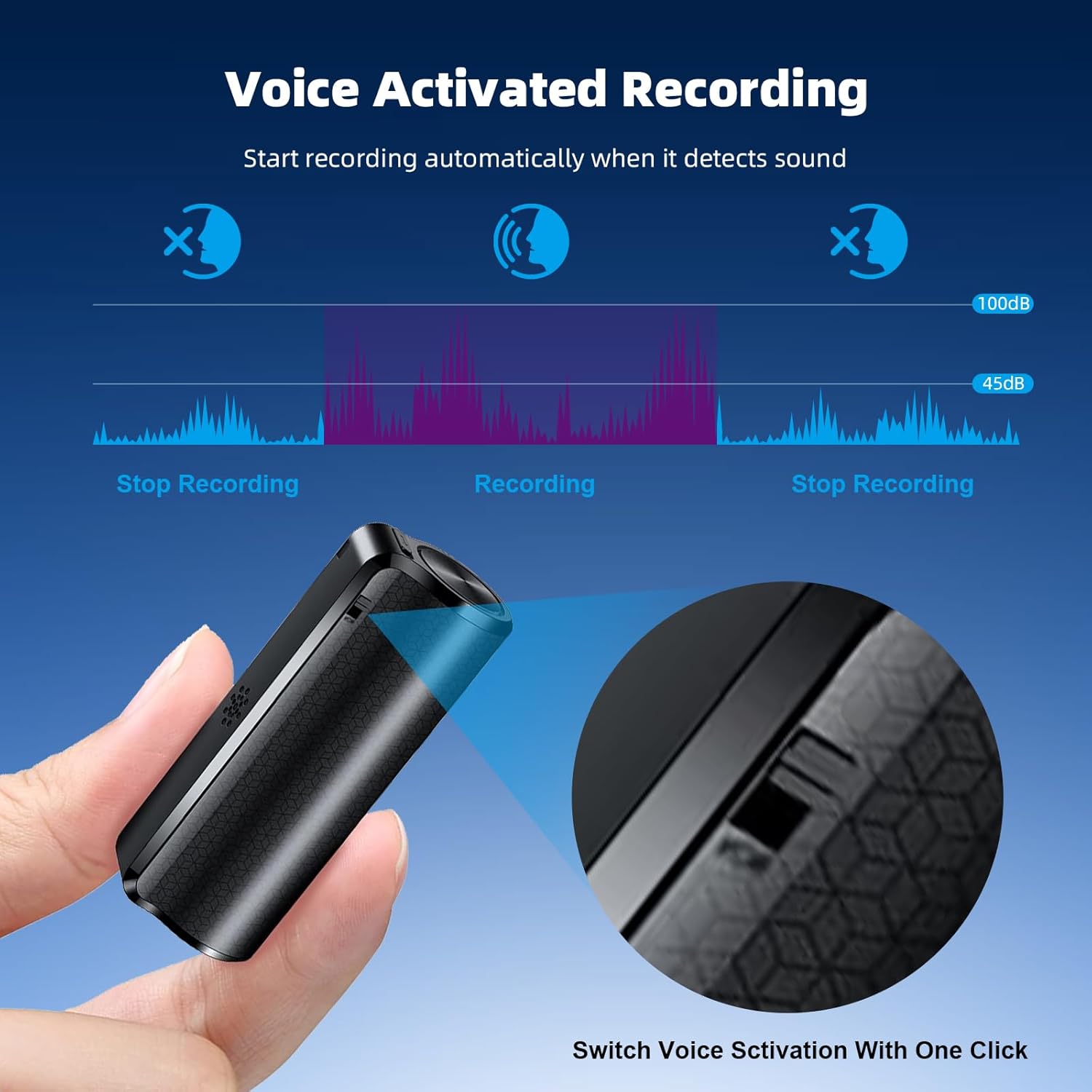 • Диктофон с гласово активиране: Този мини диктофон може да бъде настроен на режим с гласово активиране. Диктофонът записва глас само когато някой говори. Той улавя човешкия глас ясно и прецизно, така че да не пропуснете важни детайли от разговора. Диктофонът спира записа, когато никой не говори. Това намалява тишината и спестява време за възпроизвеждане и място за съхранение. Идеален за класни стаи, срещи, интервюта, лекции и други поводи.