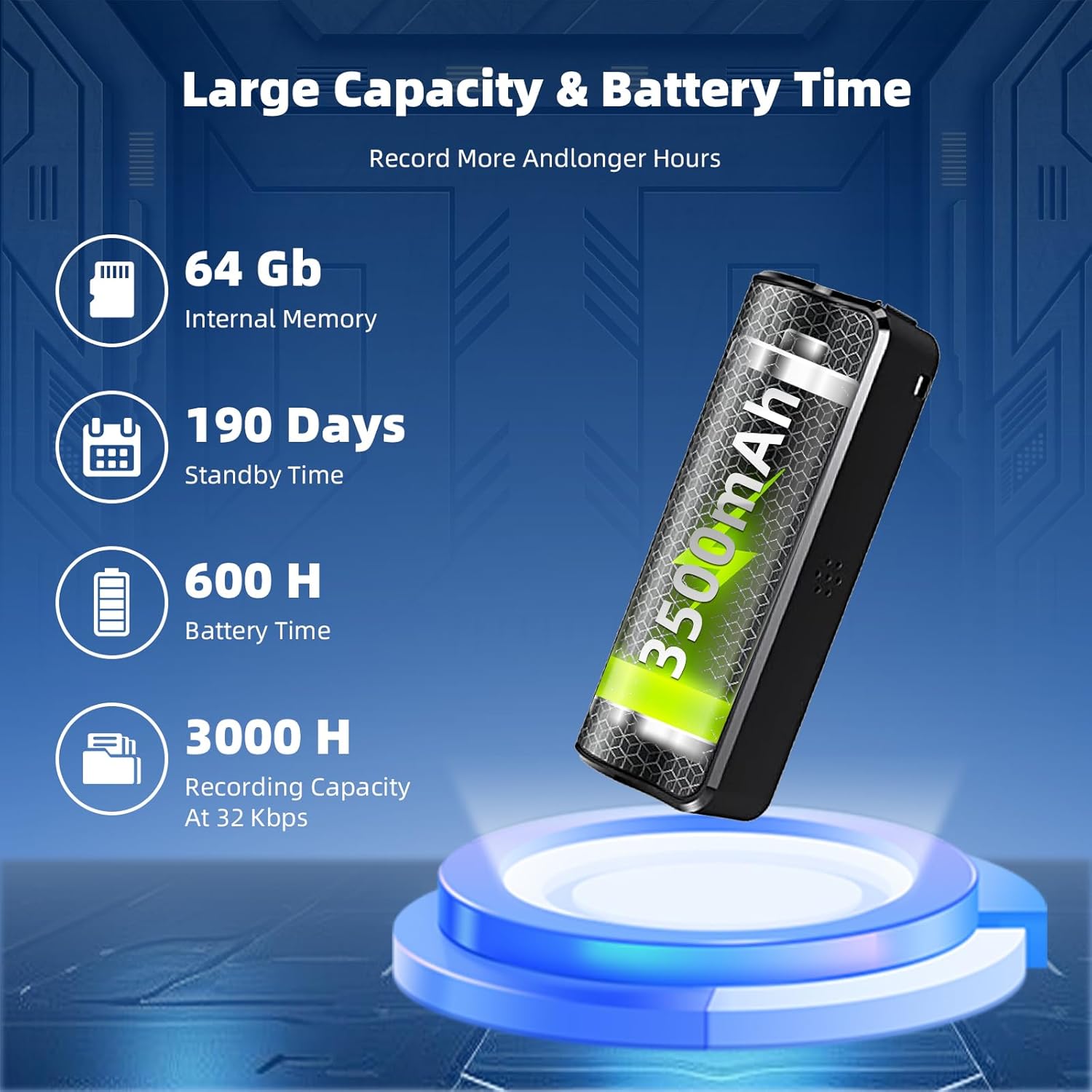 • 30 дни непрекъснат запис: Диктофонът е оборудван с батерия с висок капацитет 3500mAh, която позволява запис до 30 дни или (600 часа), което предлага до 380 дни в режим на готовност. Паметта от 64GB може да съхранява до 2800 часа записи. Само с едно зареждане, той отговаря на изискванията на различни сценарии.