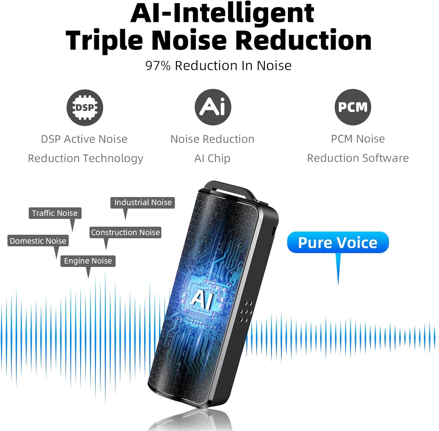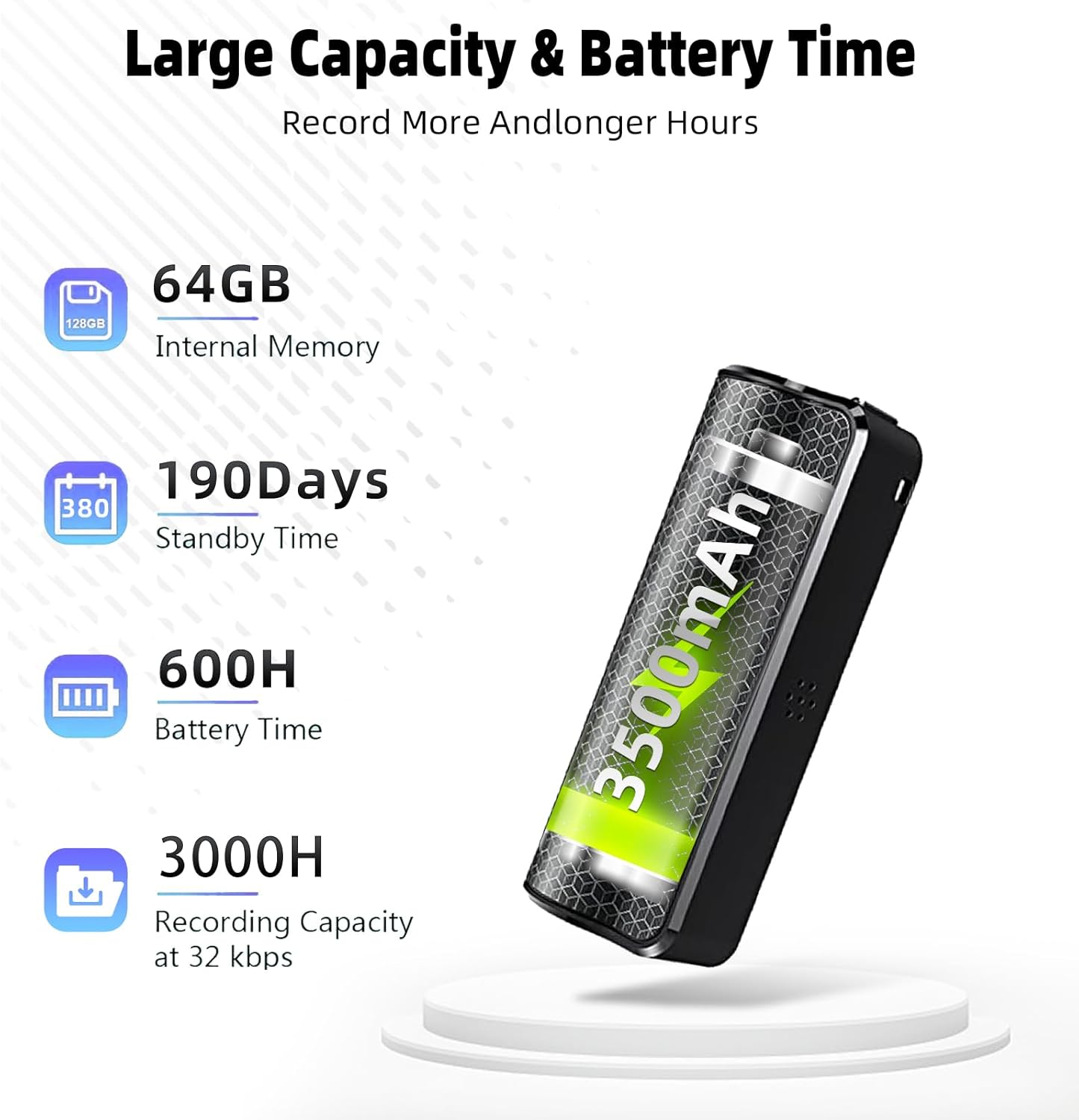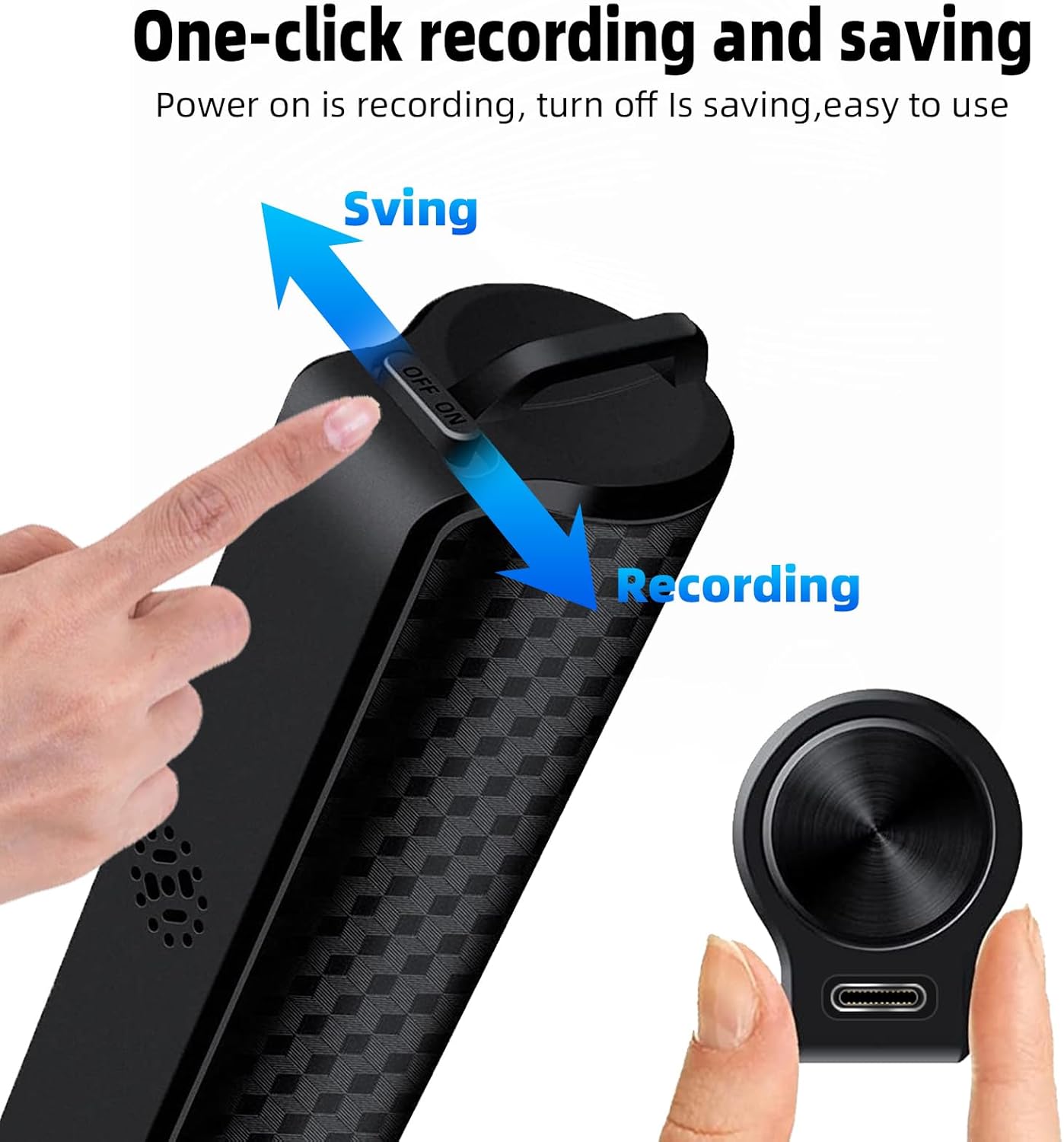 Този преносим диктофон с гласово активиране е компактен и се побира лесно в джоба или дланта ви. Просто плъзнете бутона до „Вкл.“, за да започнете записа, и до „Изкл.“, за да запазите.