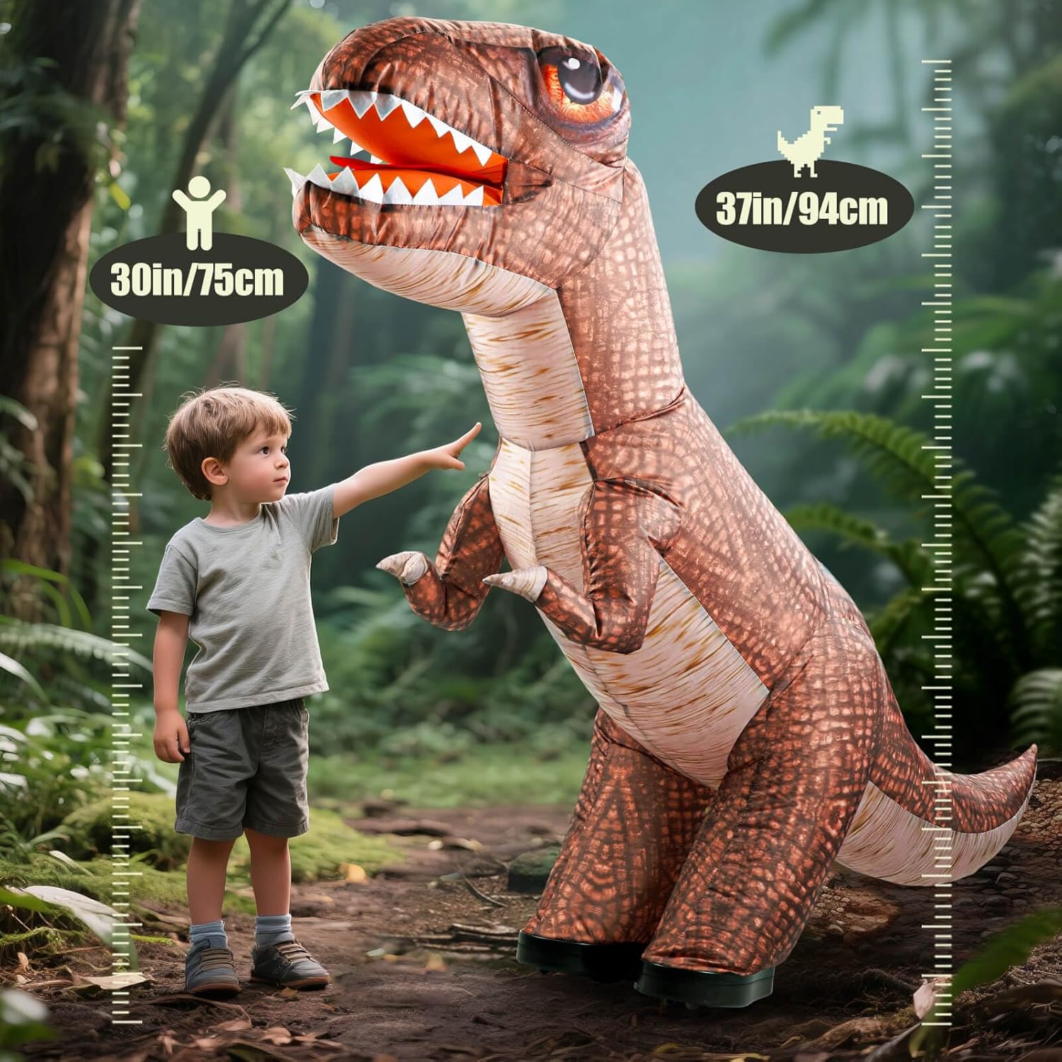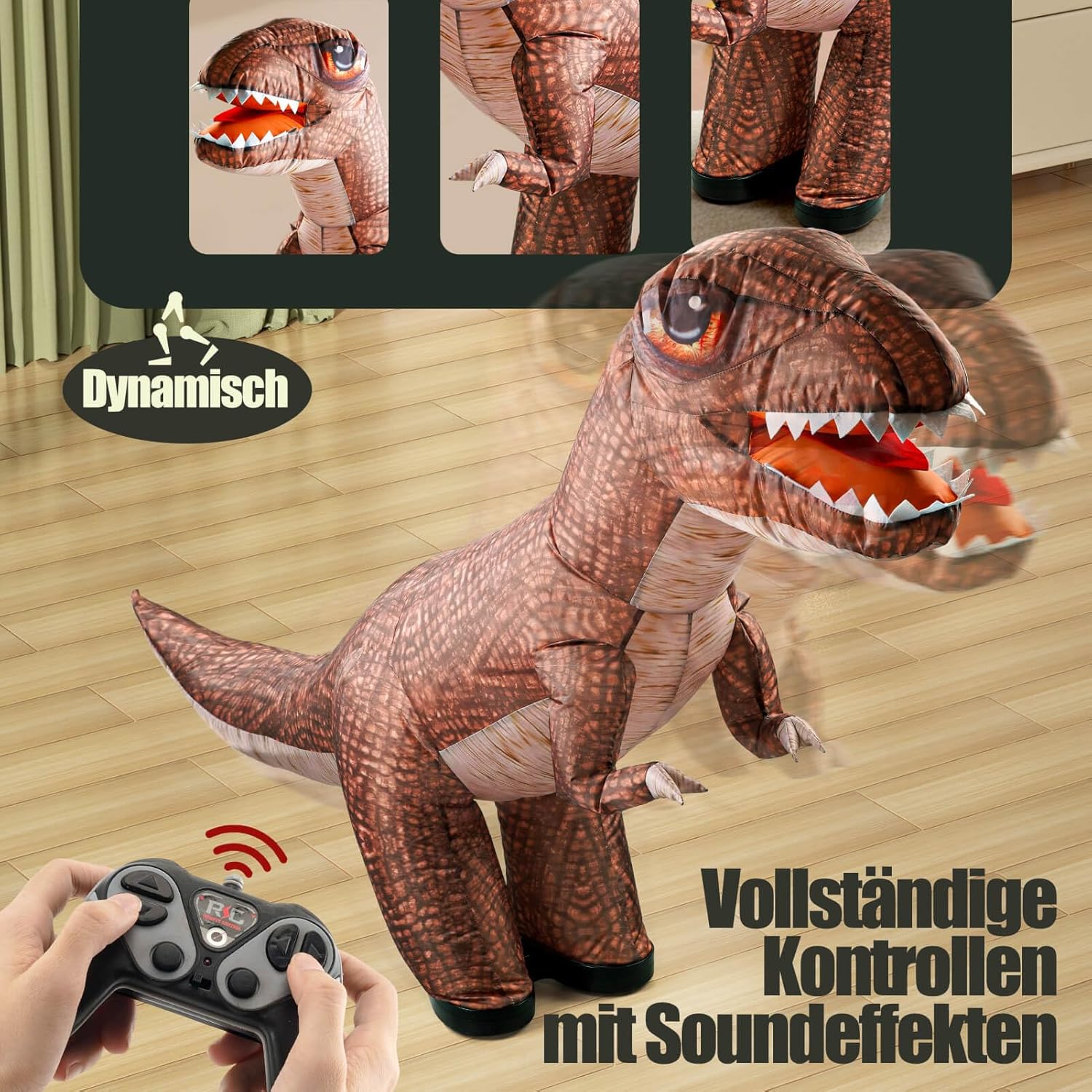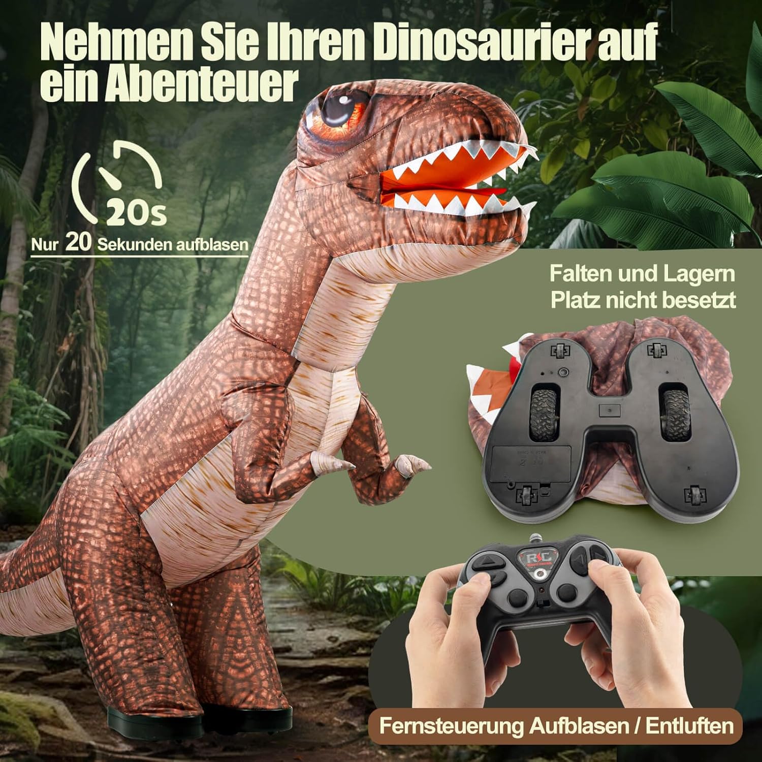 • Надуваем динозавър: надуваемият динозавър е висок приблизително 90 см и се надува напълно за 20 секунди. (Не е необходим специален процес на подготовка). Лесно надуване/изпускане с натискане на бутон. Това е чудесна играчка, която насърчава въображението и креативността на вашето дете.