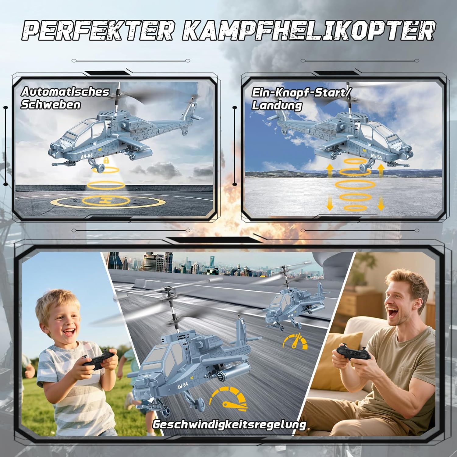 • Стартиране с едно докосване и автоматично зависване: Оборудван с усъвършенствани жироскопи, този хеликоптер стартира плавно с просто натискане на бутон. RC хеликоптерът автоматично поддържа височината по време на полет във висене и по този начин осигурява стабилни полетни характеристики. Дори деца или начинаещи, които нямат опит с дистанционното управление на хеликоптер, могат да се научат как да работят бързо и без усилие да се насладят на тръпката от летенето. Простото управление осигурява безопасно и безгрижно изживяване.