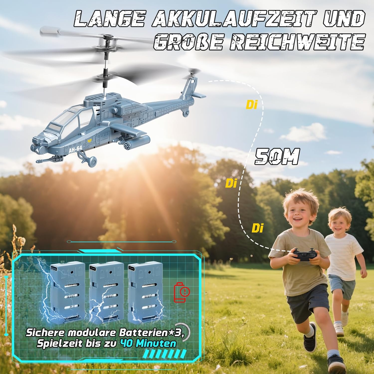 • Дизайн с тройна батерия, изключително дълго време на полет: този хеликоптер с дистанционно управление за деца е оборудван с три презареждащи се батерии. Всяка батерия позволява време на полет от приблизително 14 минути, общо до 40 минути непрекъснато забавление при летене за безпроблемно управление. Времето за зареждане е само приблизително 30 минути, лесно, безопасно и с бързо USB зареждане и червен индикатор за зареждане. Така децата ще преживеят интензивно полетно приключение, където всяко излитане и кацане е пълно с изненади и радост - за уникално и вълнуващо преживяване. Дистанционното управление изисква 3 AAA батерии (не са включени).