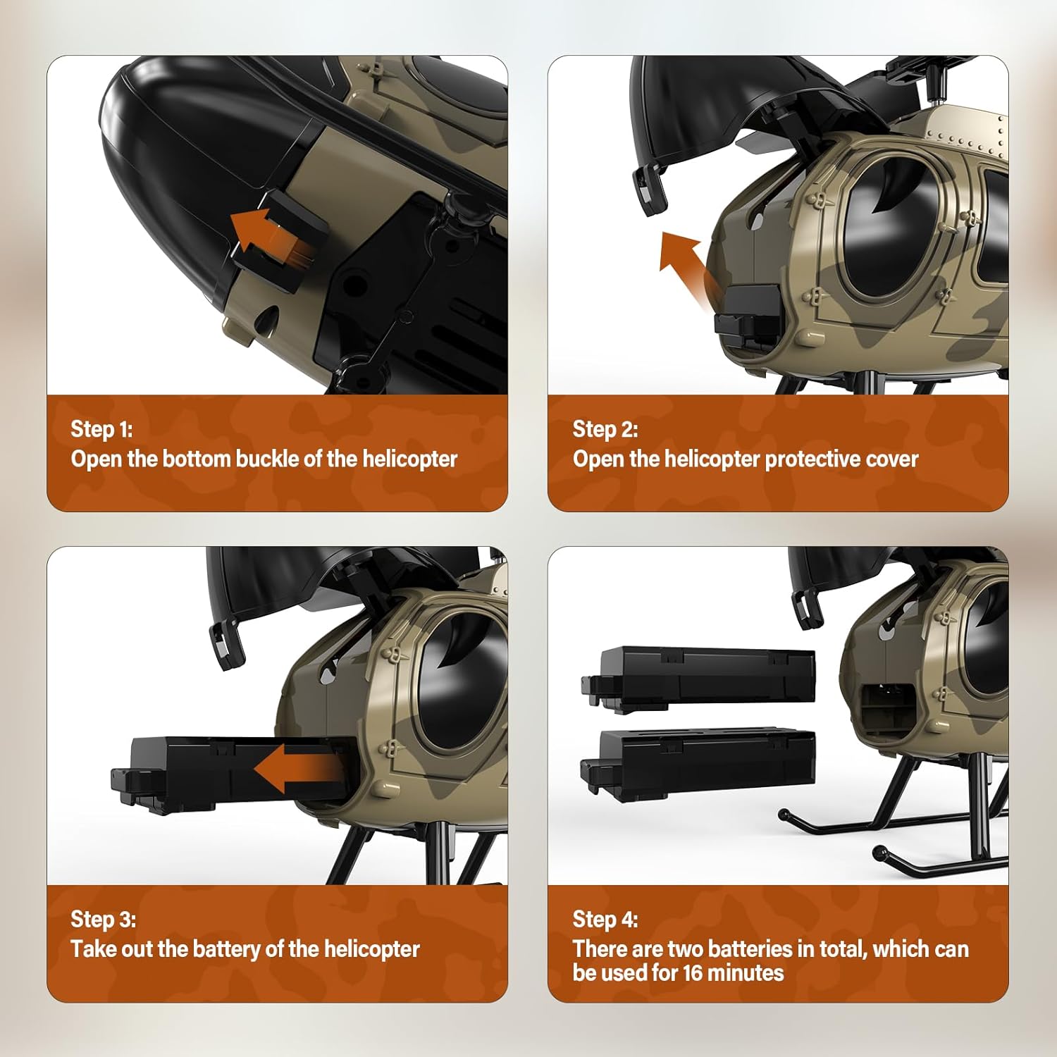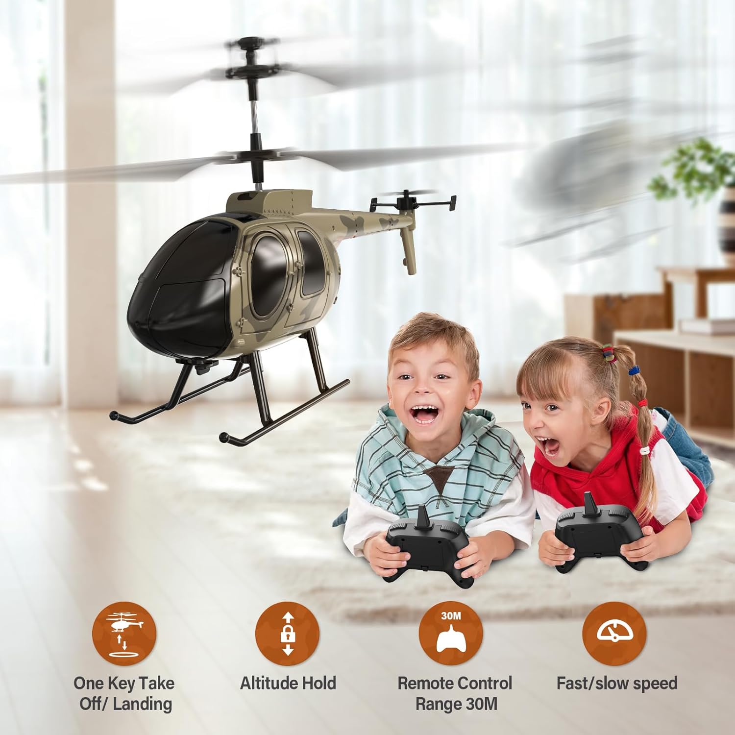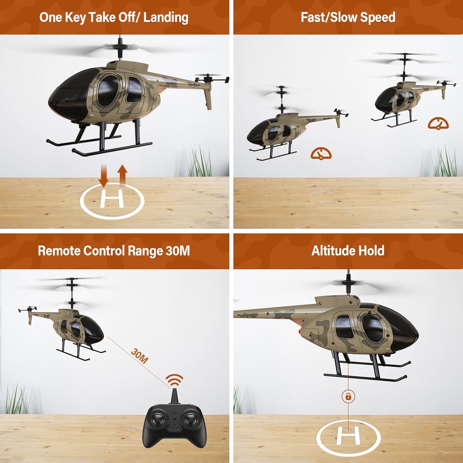 • Страхотен дизайн: този хеликоптер има уникален военен вид, идеален за деца, които обичат военна техника, а камуфлажният външен дизайн прави този RC хеликоптер да изглежда страхотно във всяка позиция.