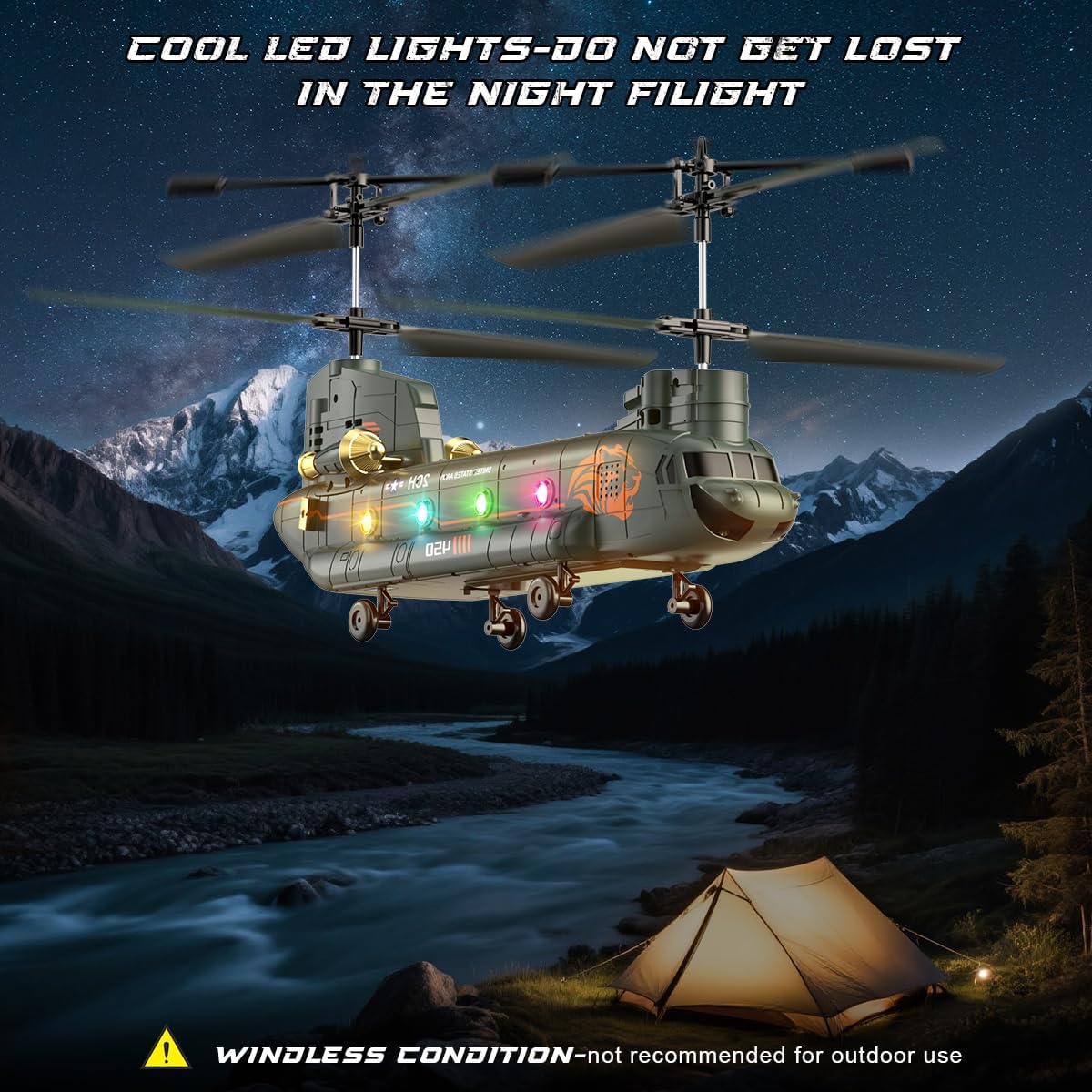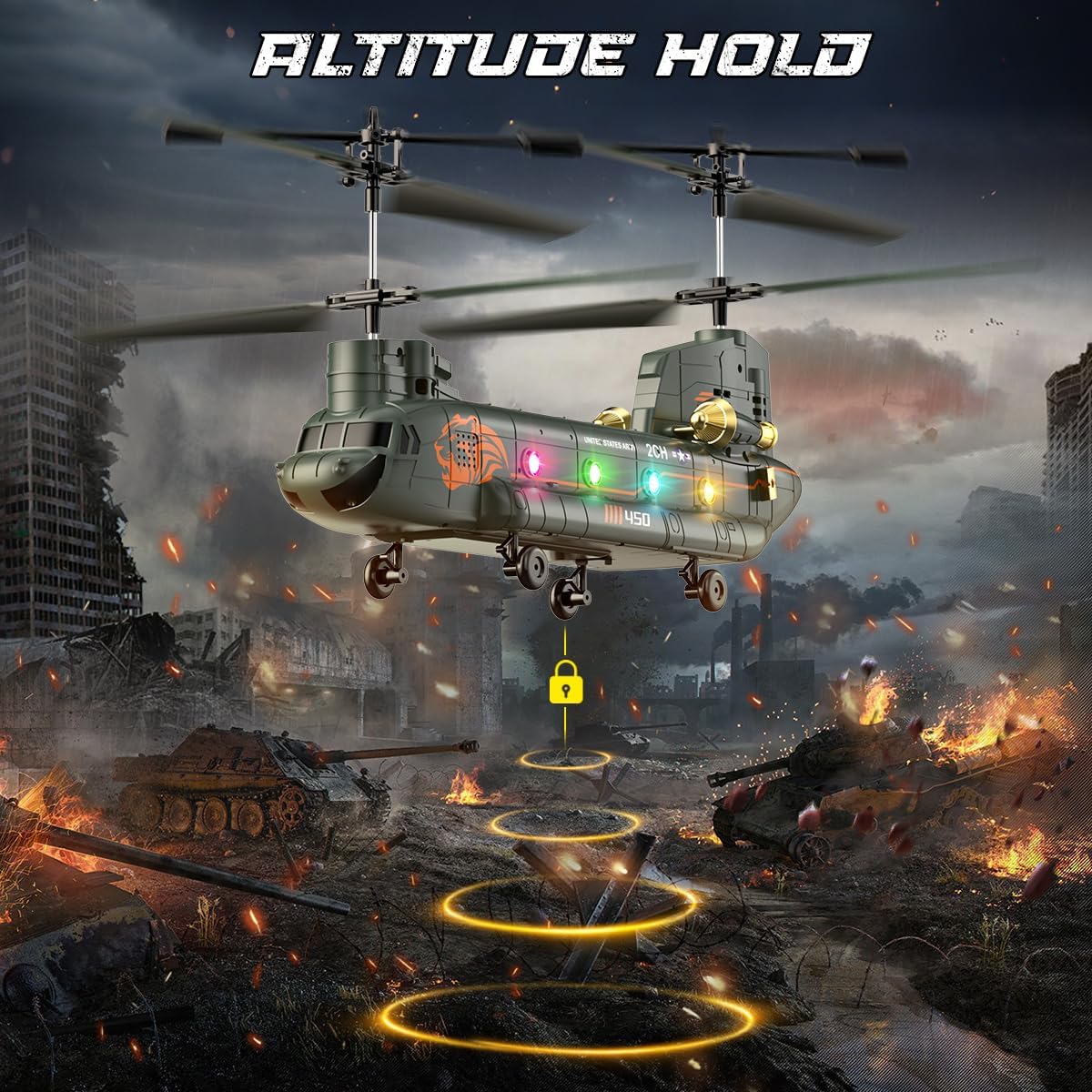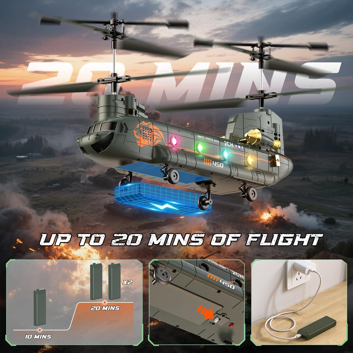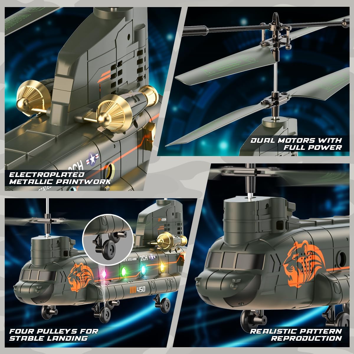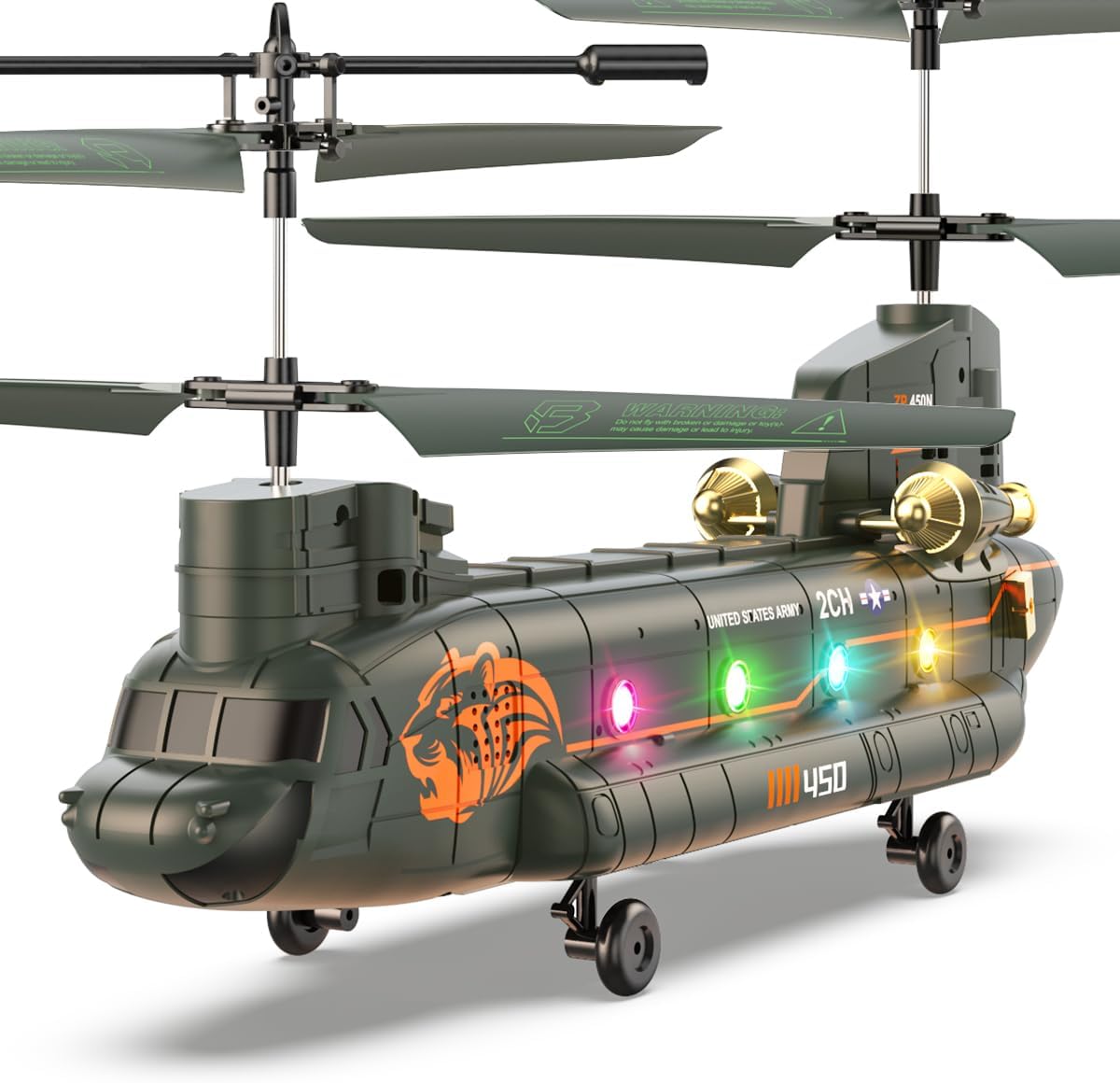 • Готин транспортер Chinook: Изживейте тръпката от истински военен полет с RC хеликоптера VATOS. Този хеликоптер Chinook е оборудван с два витла, галванизирана метална боя, четири ролкови колела за стабилно кацане и два двигателя за пълна мощност, както и с готини светлини и много реалистични детайли, които гарантирано ще привлекат много ентусиасти на хеликоптери.
