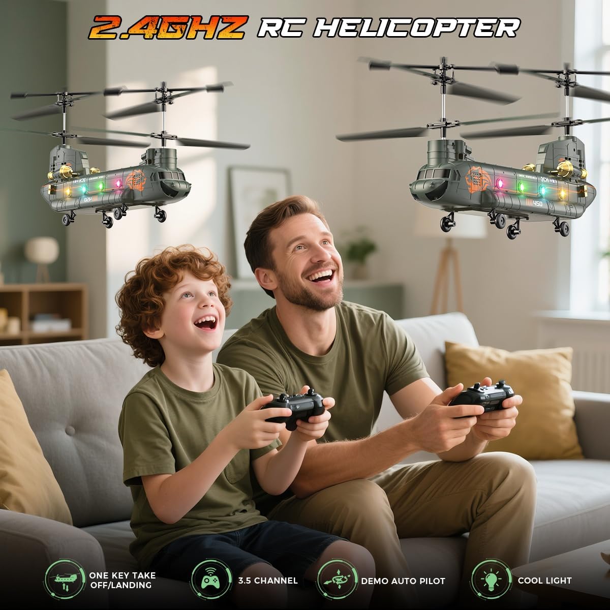 Дистанционно управляван хеликоптер VATOS, 2.4 GHz военен транспортен RC хеликоптер със задържане на височина, старт/кацане с един бутон, LED светлина, армейска RC играчка хеликоптер за момчета, деца и военни фенове