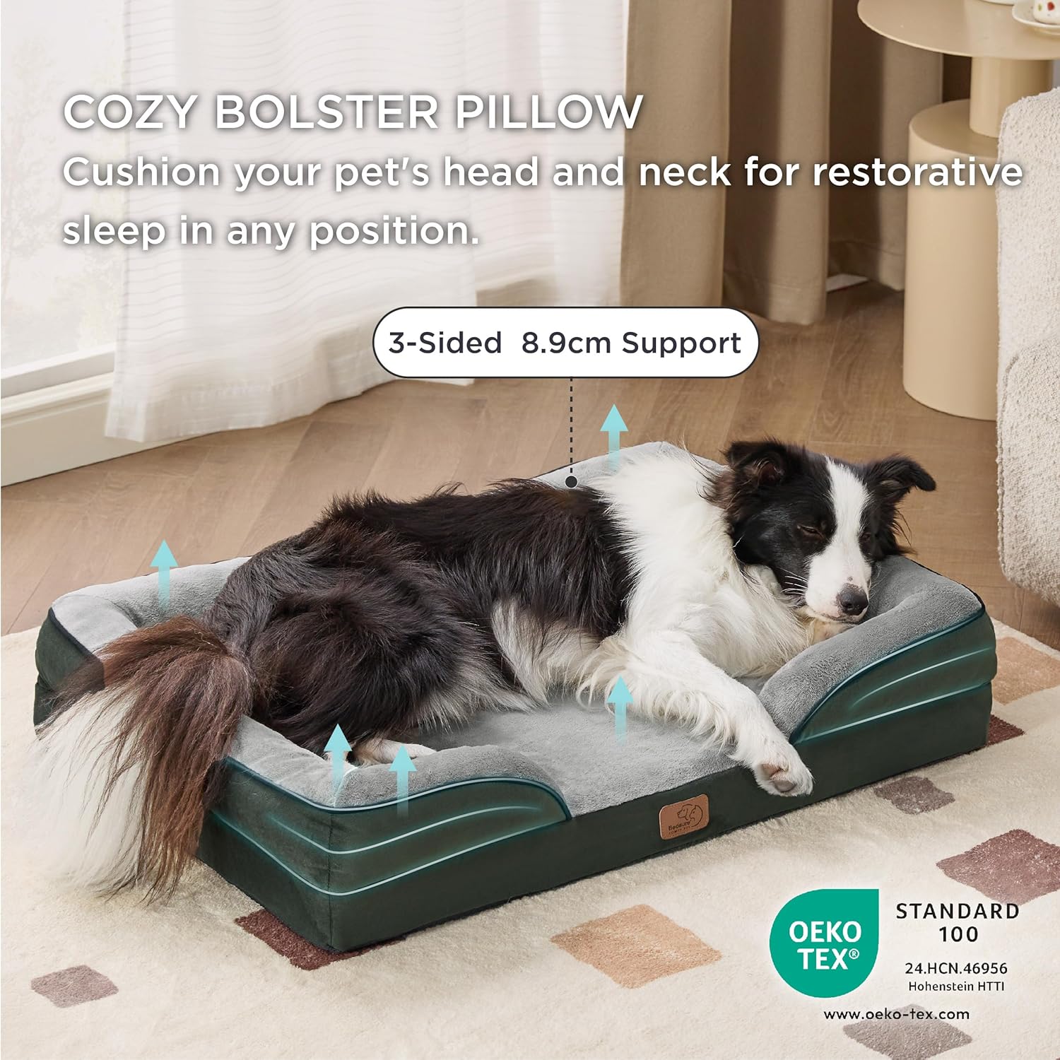 Диван за кучета Bedsure Large - Ортопедични легла и диван за кучета, които могат да се перат, със свалящ се фланелен калъф, Водоустойчива възглавница за кучета с U-образна подплата, Тъмнозелено квадратно легло за домашни любимци, подходящо за до 30 кг, 97x71x16 см