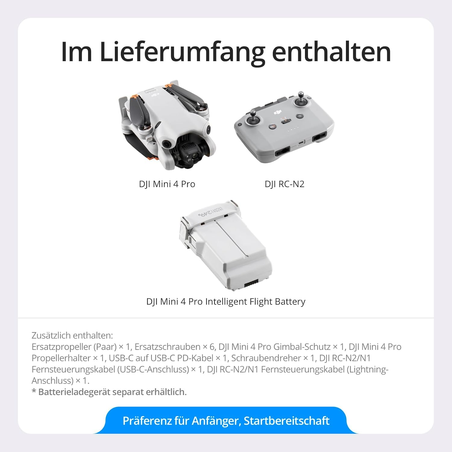 DJI Mini 4 Pro (DJI RC-N2 remote control) includes the drone and the DJI RC-N2 remote control. A good choice for beginners.
