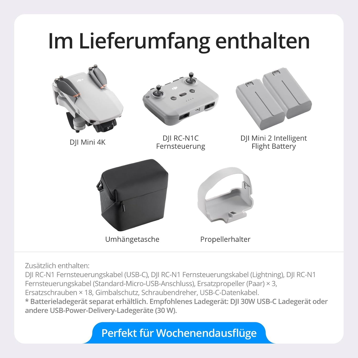 • Пълен комплект с DJI Mini 4K, 2 батерии, DJI RC-N1C, чанта за през рамо, държач за перка, резервни перки и др. Повече време за полет, по-безопасен транспорт и по-бърз старт. Като дрон с 4K камера за възрастни, той заснема пътувания, открито и семейство без усилие.