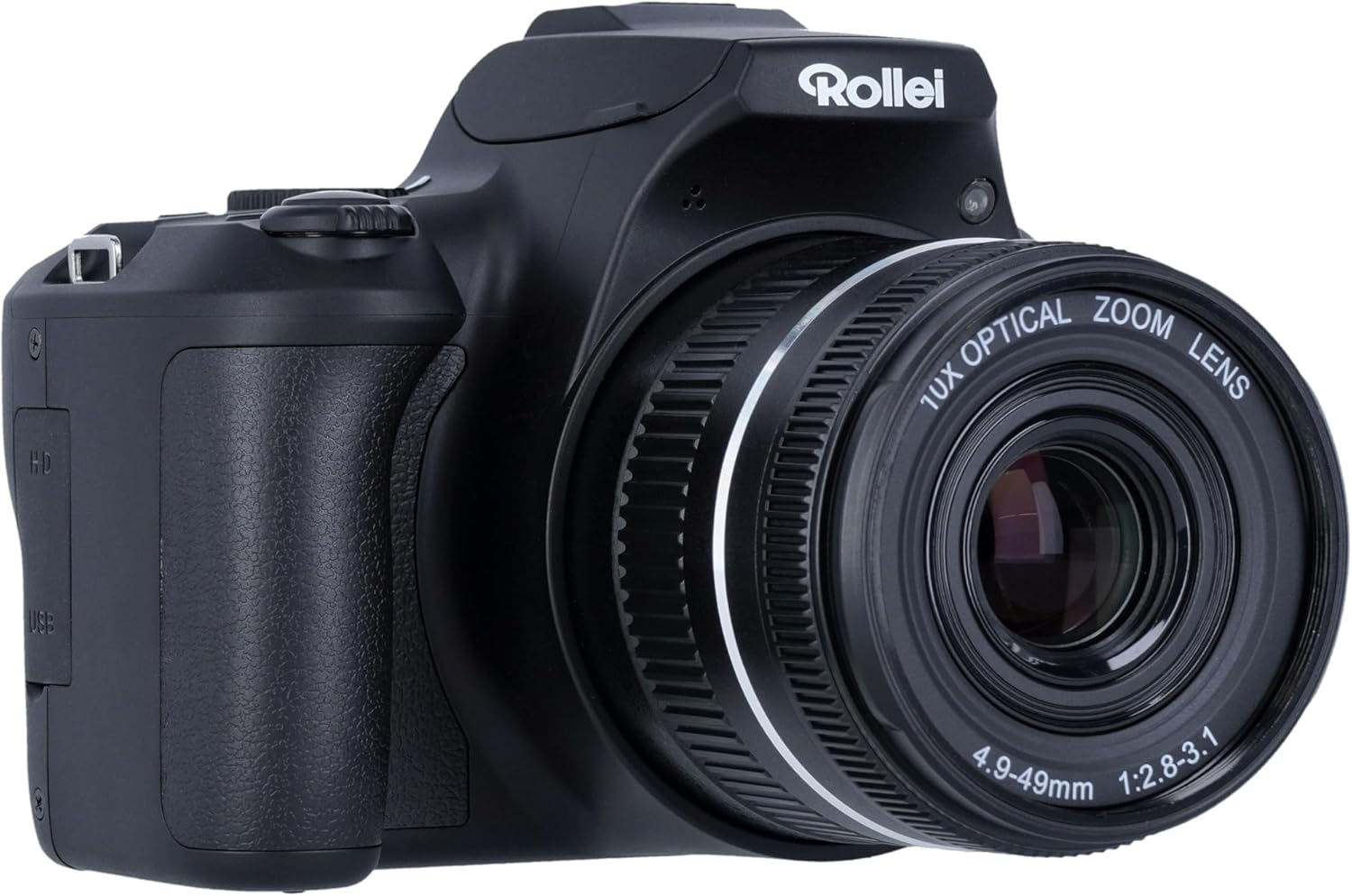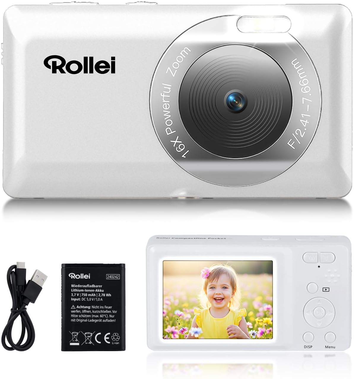 Джобен цифров фотоапарат Rollei Compactline, бял, 50MP 2.7K камера с 16x цифрово увеличение, преносим фото фотоапарат с 2.4-инчов дисплей, лек компактен фотоапарат за деца, тийнейджъри, студенти