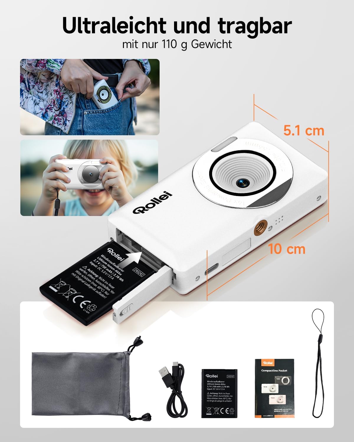Джобен цифров фотоапарат Rollei Compactline, бял, 50MP 2.7K камера с 16x цифрово увеличение, преносим фото фотоапарат с 2.4-инчов дисплей, лек компактен фотоапарат за деца, тийнейджъри, студенти