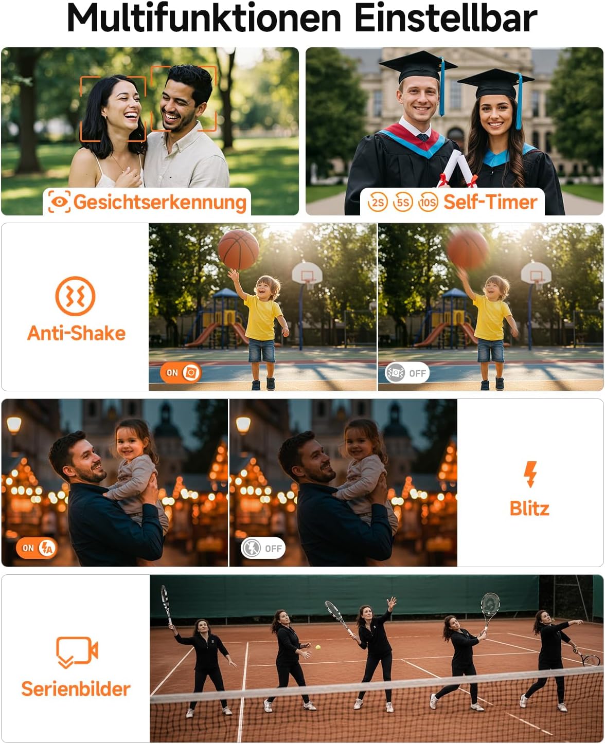 • Множество режими и функции: Тази влог камера предлага различни режими на снимане за всяка ситуация, така че можете да дадете воля на креативността си. Освен това, тя може да се използва като уеб камера, което прави комуникацията ви по-жива - идеална за видео разговори, предавания на живо или взаимодействия в платформи като TikTok, YouTube, Facebook и др.