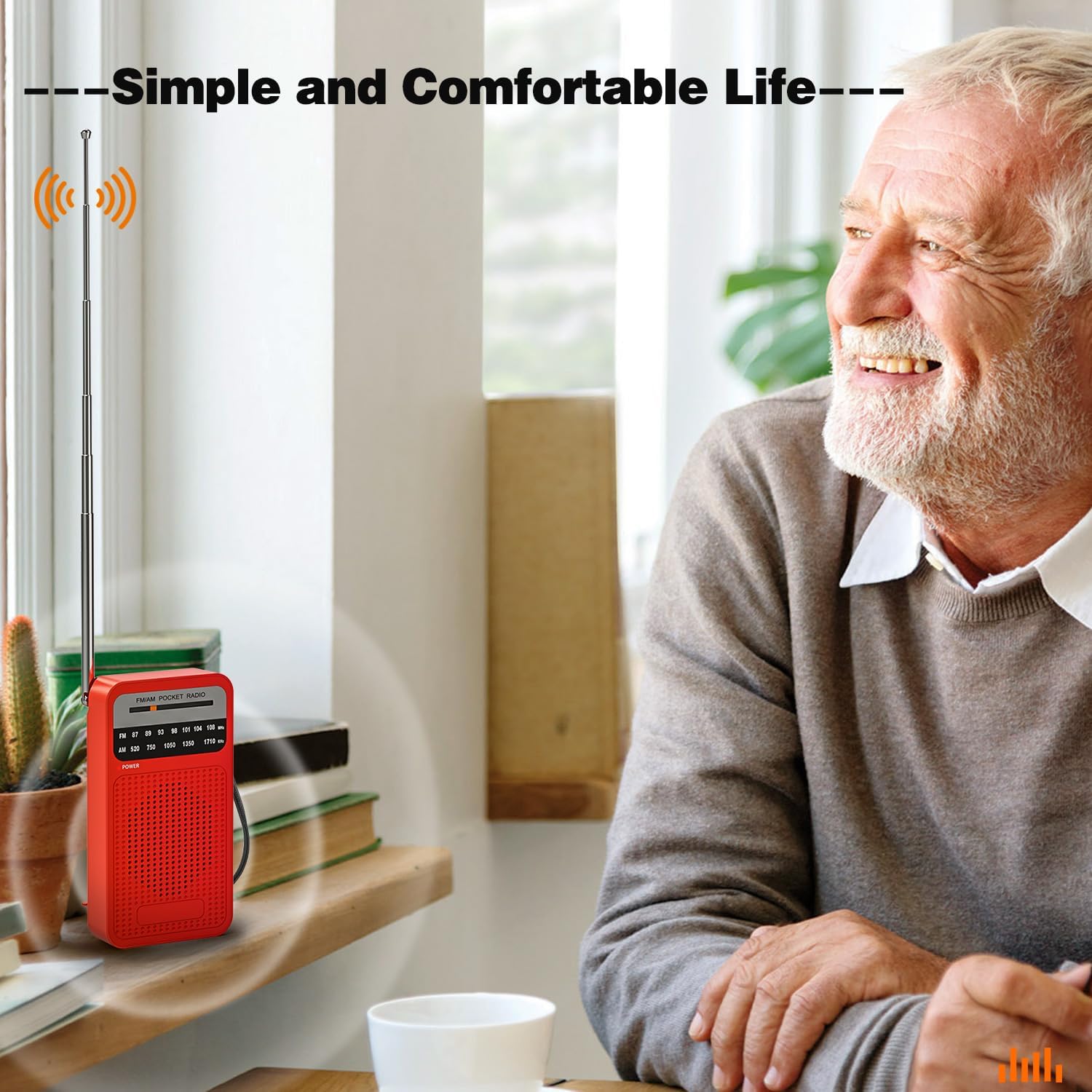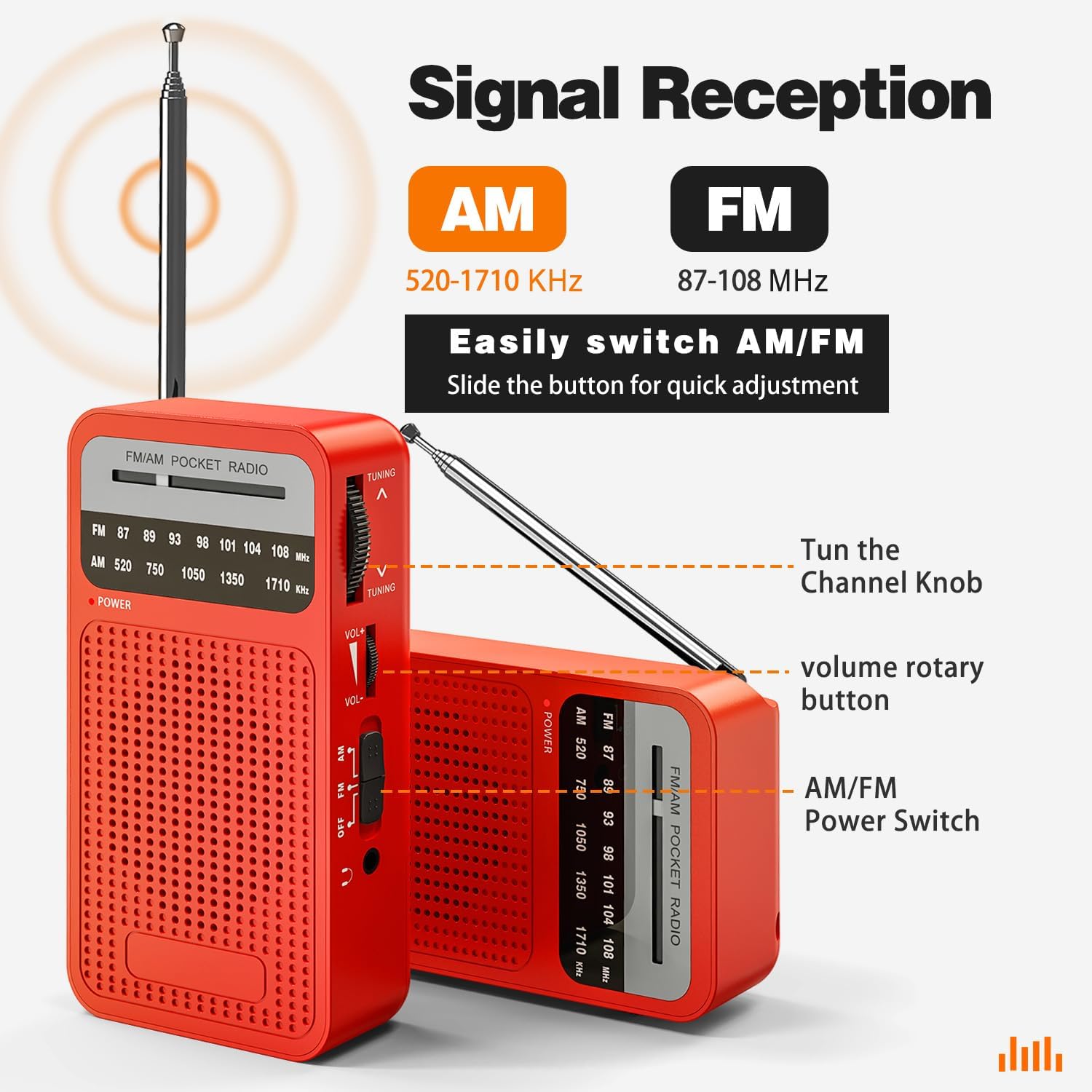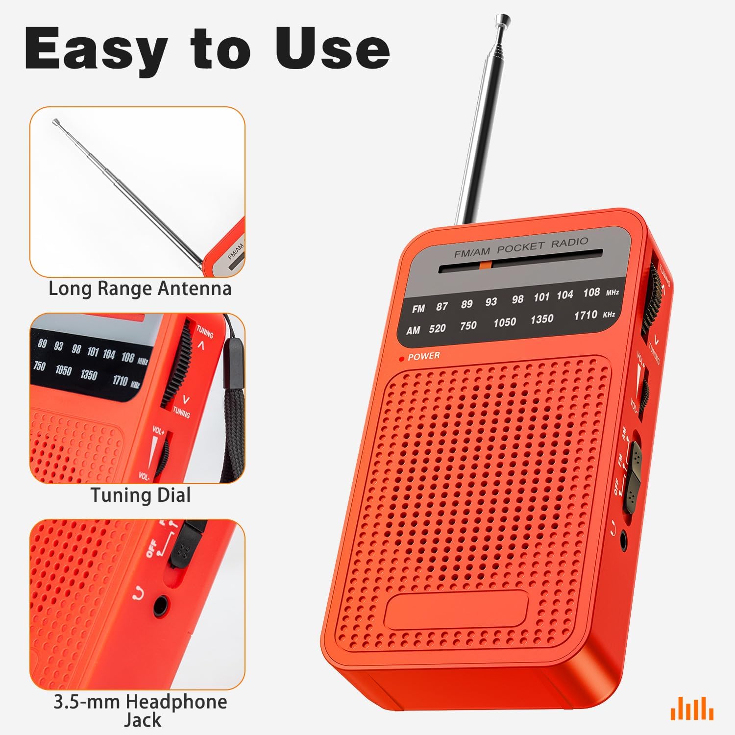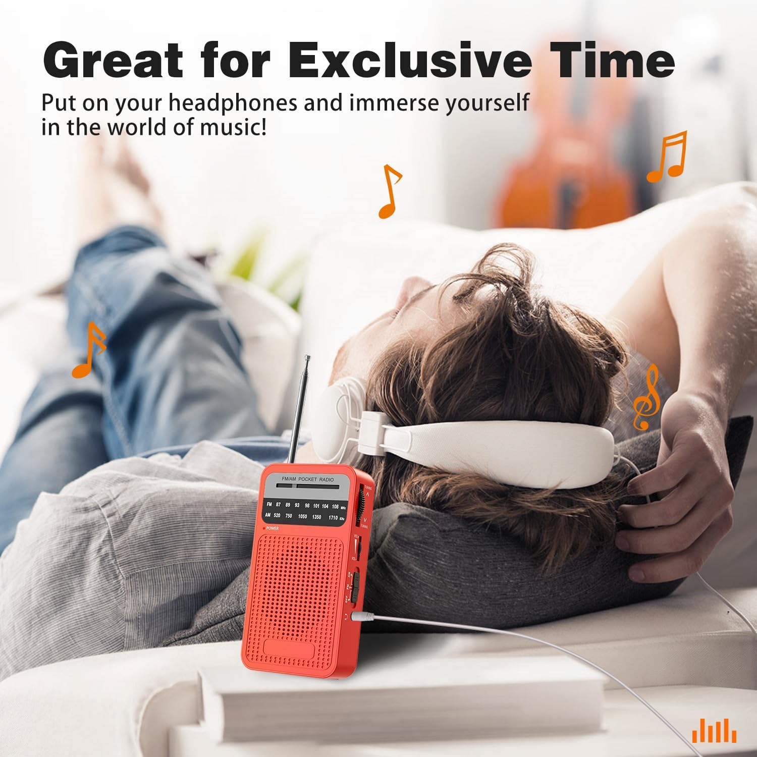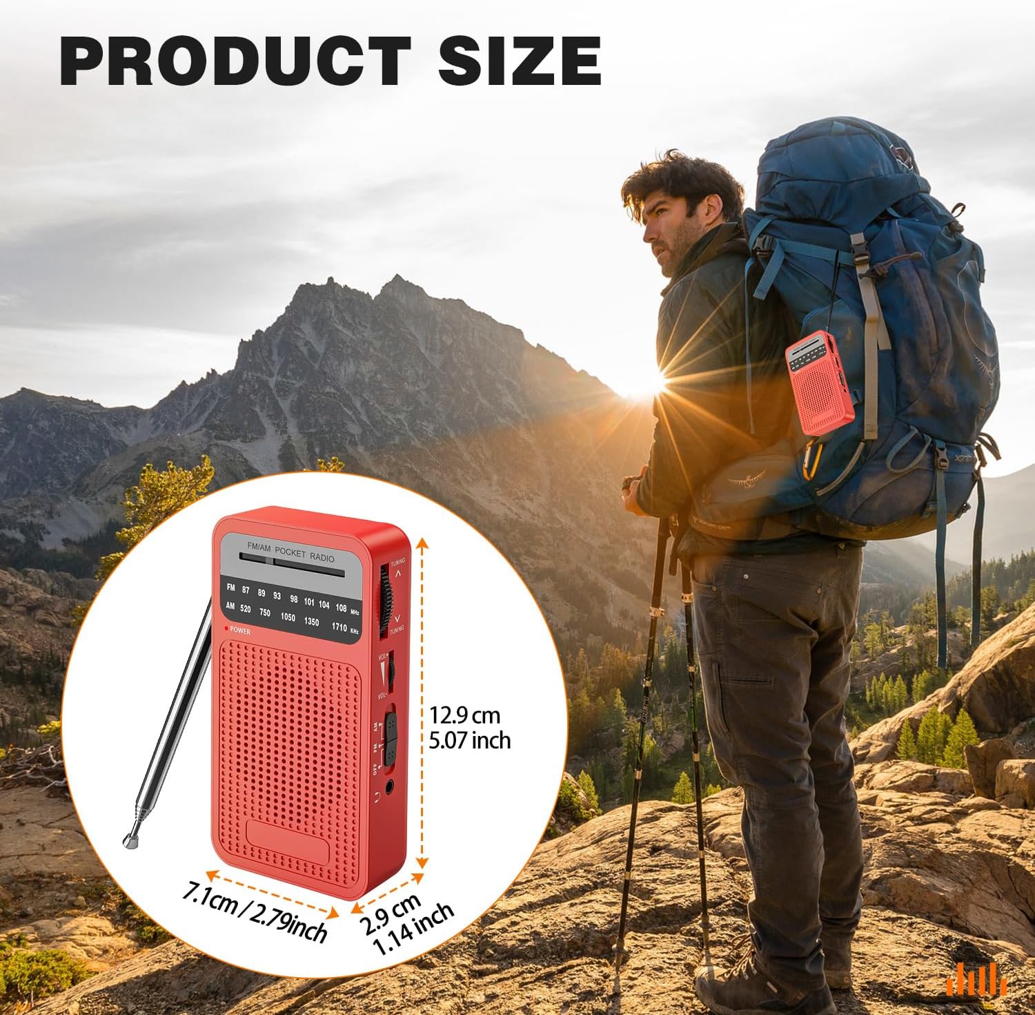 Джобно радио с батерии FM/AM, малко радио с вграден стерео високоговорител/жак за слушалки, преносими радиостанции с AA батерии за туризъм, джогинг и къмпинг (червено)