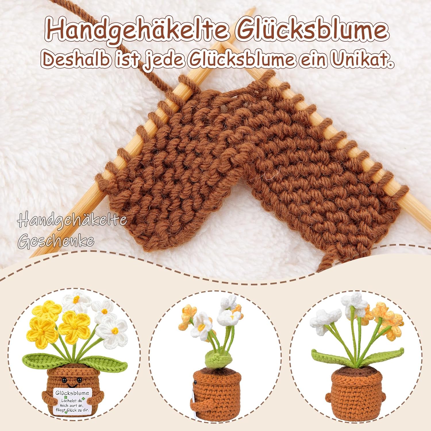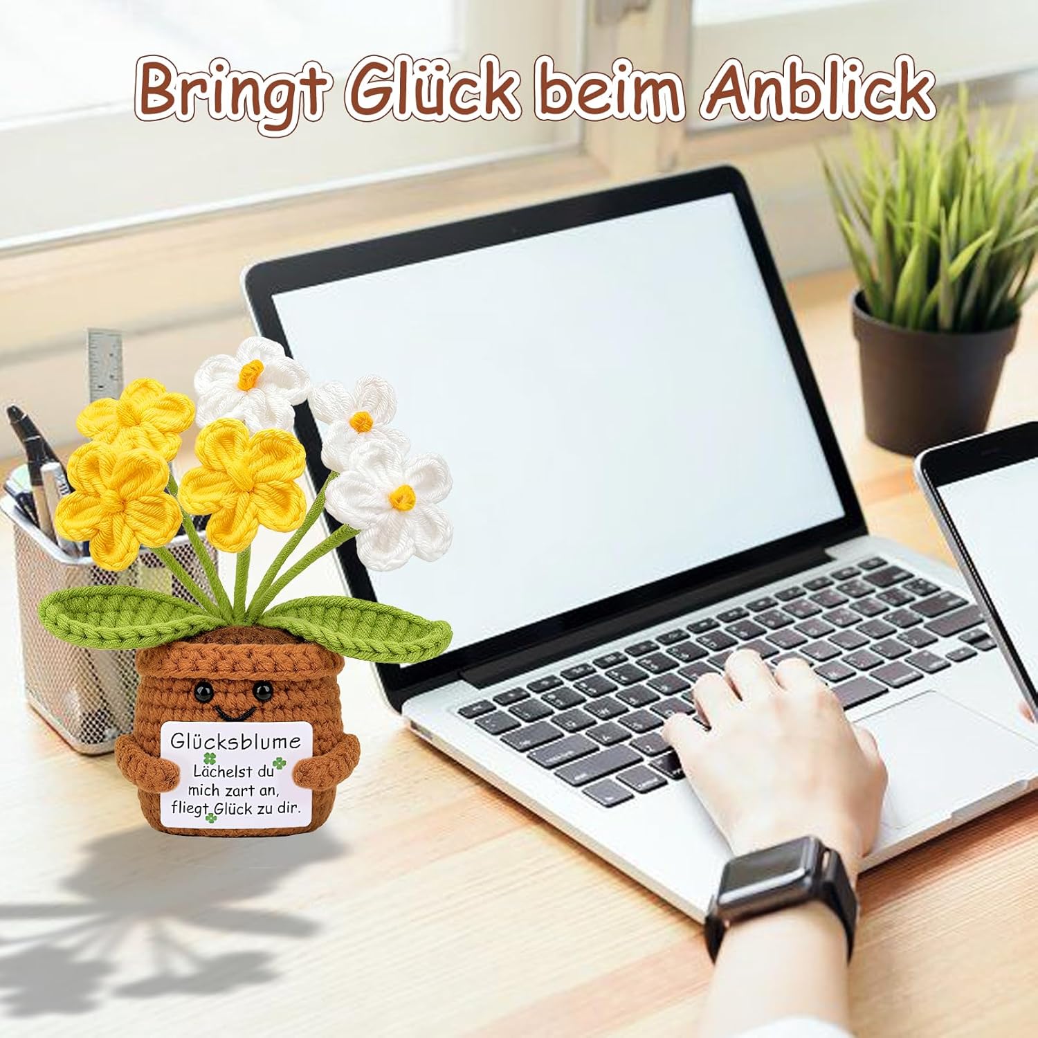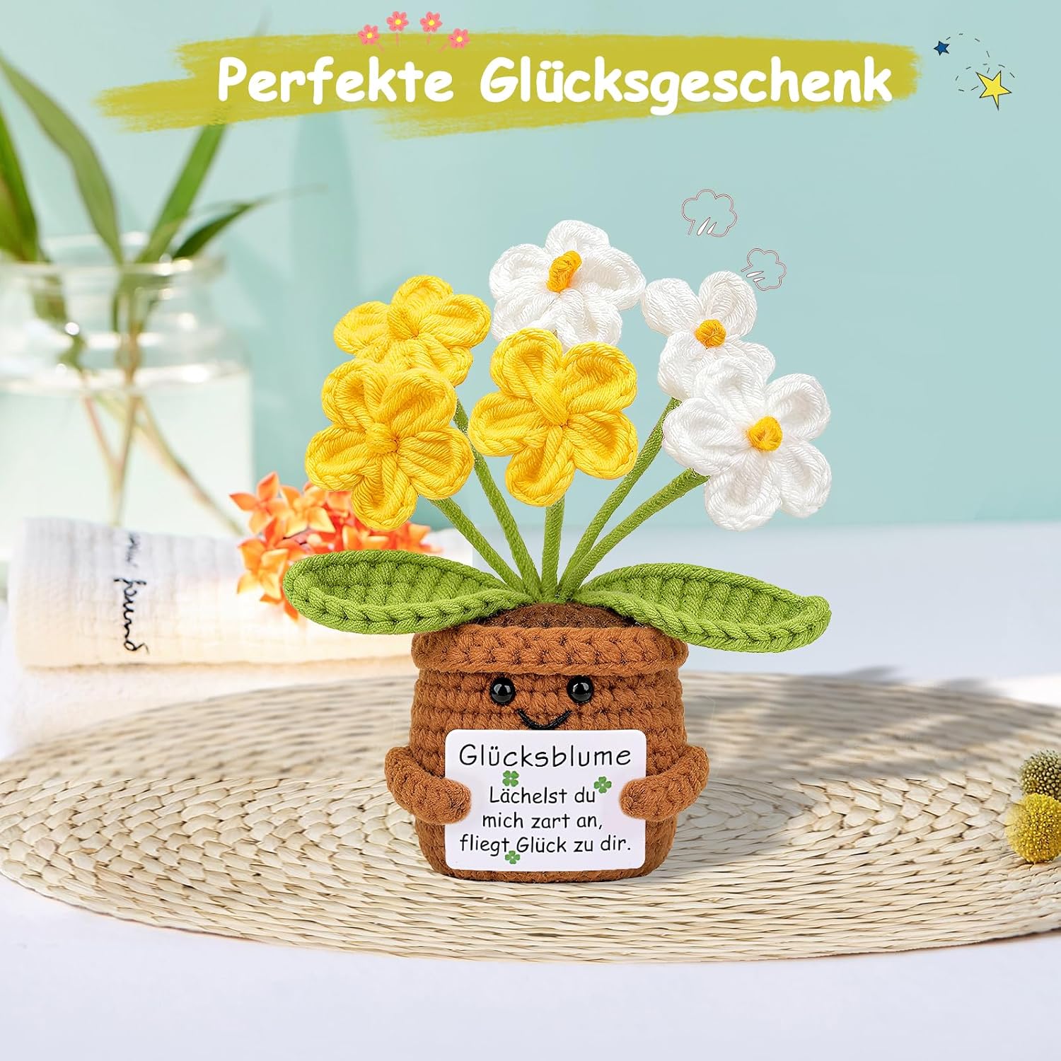 Джобно цвете за късмет, креативна вълна за плетене, позитивно цвете, немски талисман за късмет с позитивен картоф, насърчителни подаръци, сладки подаръци за приятели, колеги и семейство