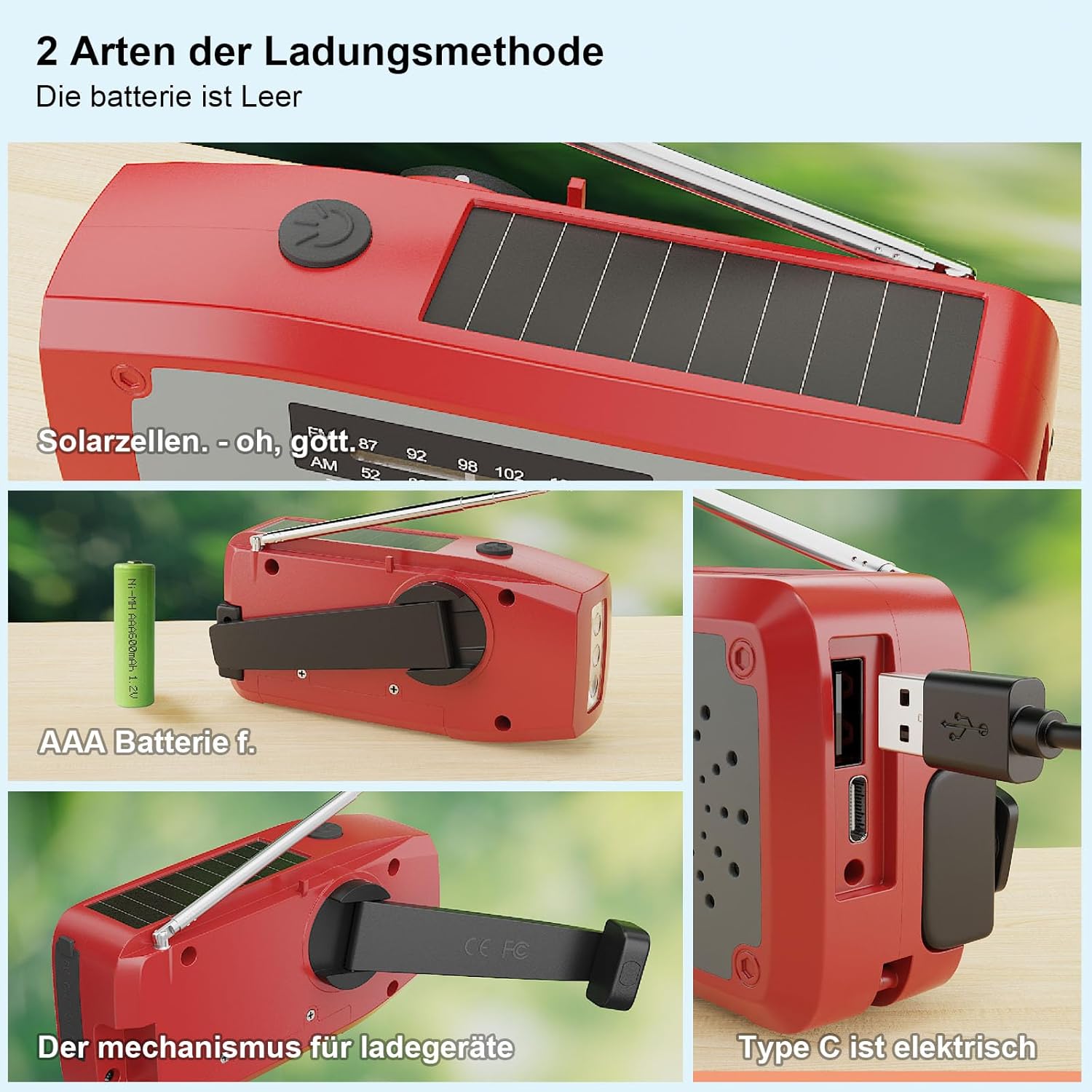 • 1. Подобрена версия с 3 опции за работа с батерии: няма електричество? Няма притеснения. Благодарение на 3-те си метода на зареждане, презареждаемата радиостанция е винаги готова за употреба. Мощната батерия от 2000 mAh може да се зарежда чрез USB кабел, соларен панел или ръчна манивела. Капацитетът на батерията на конвенционалните аварийни радиостанции и разнообразните опции за зареждане осигуряват надеждност в критични моменти.