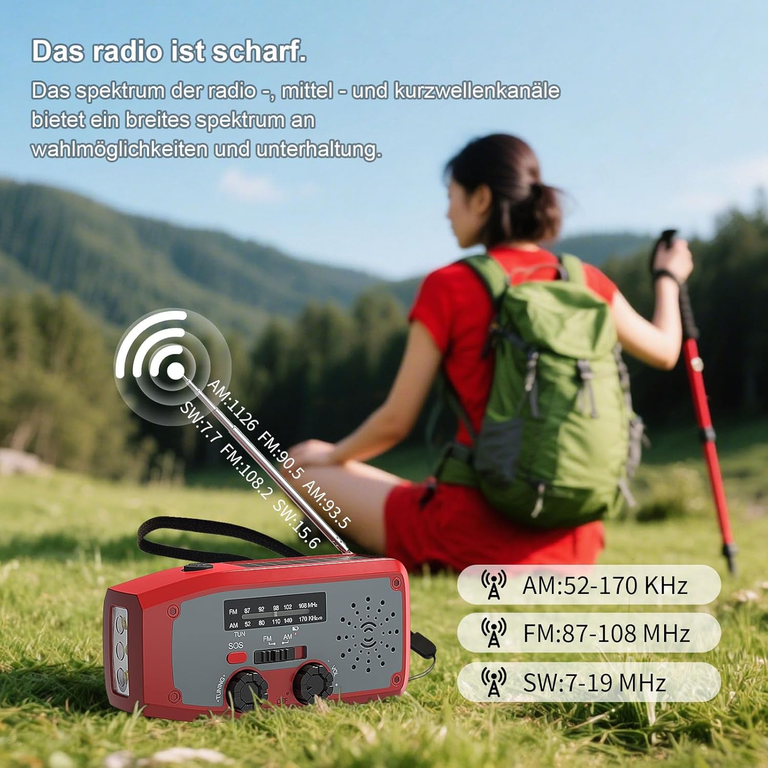 • 2. Задължително при спешни случаи: AM има по-голям обхват на приемане от FM късовълновото радио, но FM може да приема развлекателни предавания, спорт, токшоута и съобщения по-ясно в рамките на десет километра. Ръчното радио за времето приема 7-канални прогнози за времето в реално време (само за САЩ и Канада), като земетресения, урагани, торнадо, силни бури и др.
