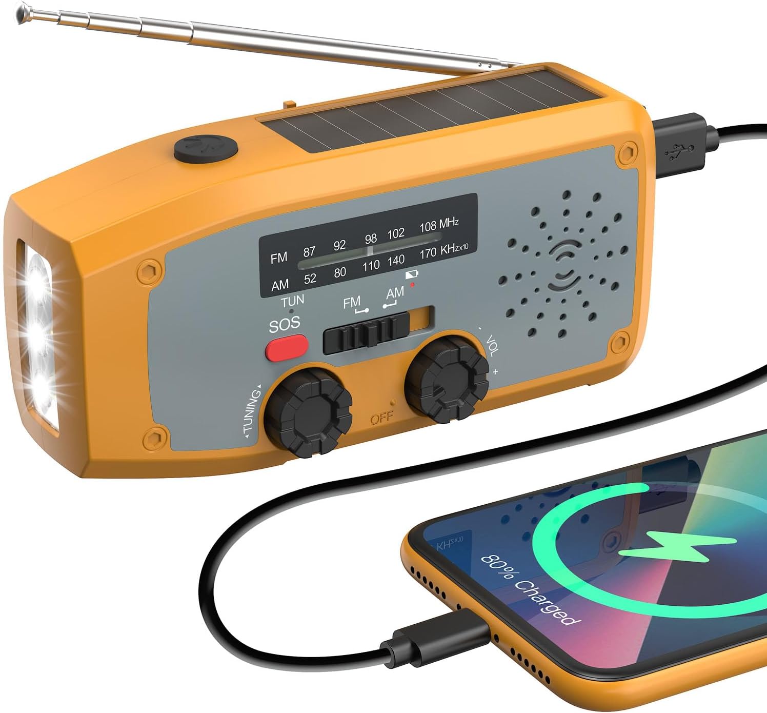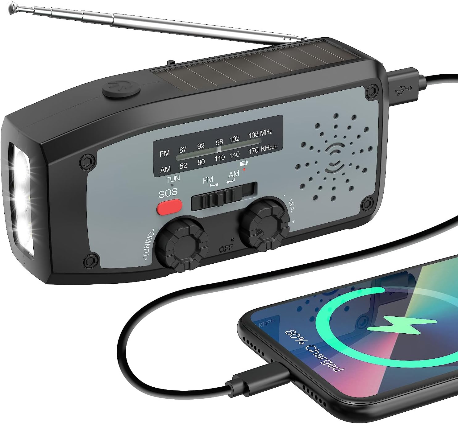 • 4. Мощно радио за спешни случаи: вградено фенерче с 3 светодиода, важно оборудване за къмпинг и комплект за оцеляване при урагани. Телескопичната антена е с дължина до 30 см и предлага високочувствително приемане, подкрепено от усъвършенстван дизайн на полупроводникова схема и LED индикатор за силата на сигнала за прецизна настройка, и тежи само 0,3 кг, което я прави лесна за носене навсякъде.