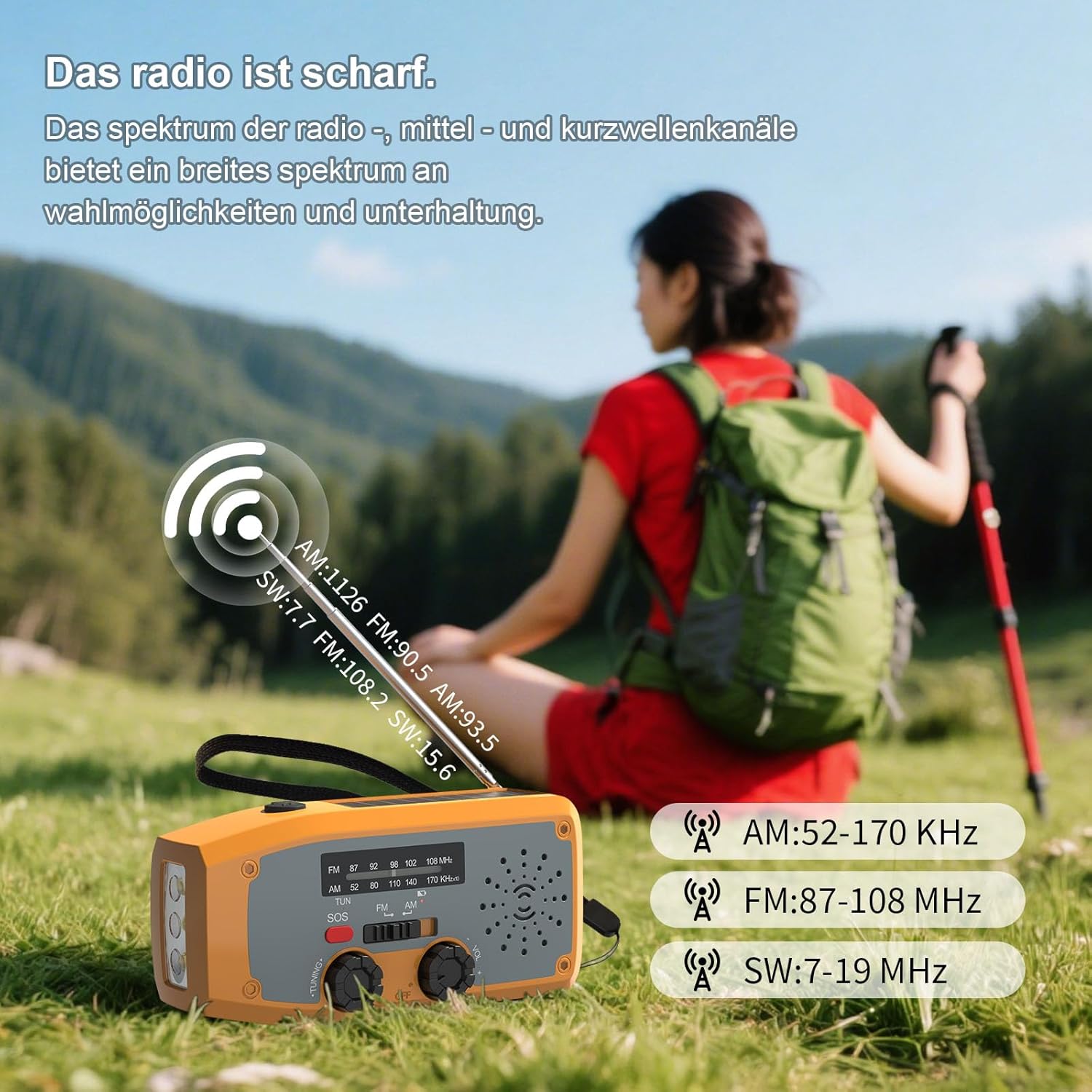 • 2. Задължително при спешни случаи: AM има по-голям обхват на приемане от FM късовълновото радио, но FM може да приема развлекателни предавания, спорт, токшоута и съобщения по-ясно в рамките на десет километра. Ръчното радио за времето приема 7-канални прогнози за времето в реално време (само за САЩ и Канада), като земетресения, урагани, торнадо, силни бури и др.