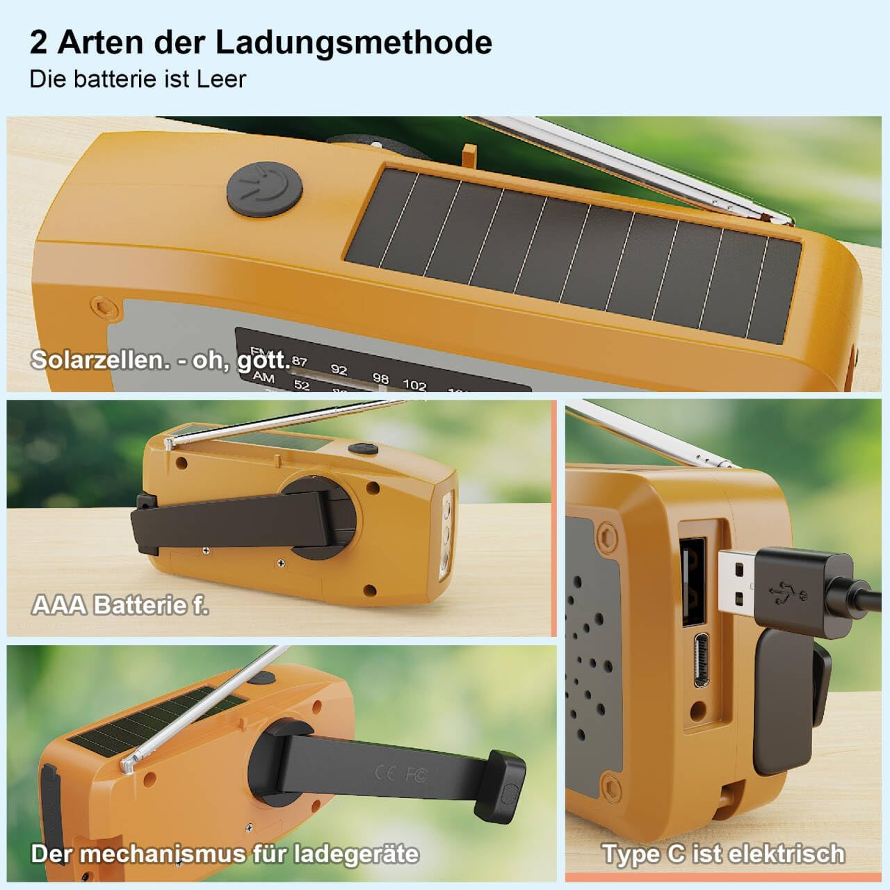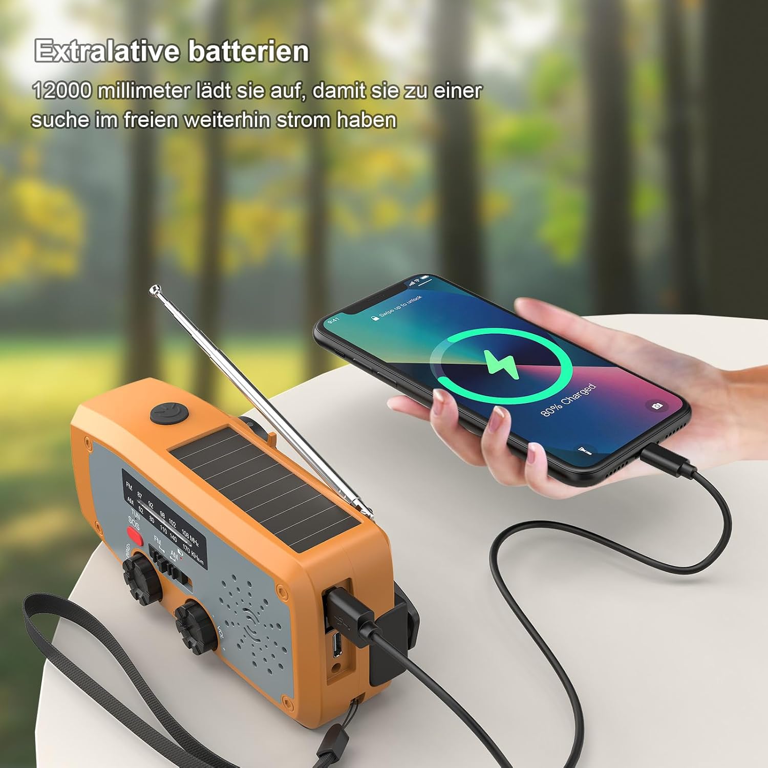 • 1. Подобрена версия с 3 опции за работа с батерии: няма електричество? Няма притеснения. Благодарение на 3-те си метода на зареждане, презареждаемата радиостанция е винаги готова за употреба. Мощната батерия от 2000 mAh може да се зарежда чрез USB кабел, соларен панел или ръчна манивела. Капацитетът на батерията на конвенционалните аварийни радиостанции и разнообразните опции за зареждане осигуряват надеждност в критични моменти.
