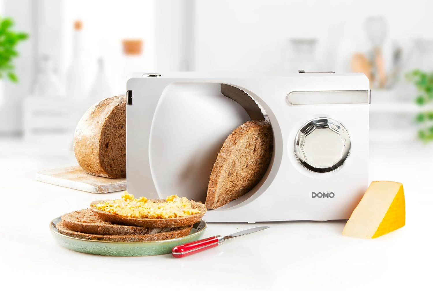 Открийте многофункционалния електрически универсален резач DOMO DO521S - компактният кухненски робот за прецизно рязане на хляб, колбаси, сирене и много други.