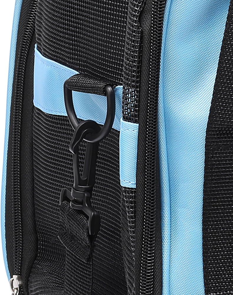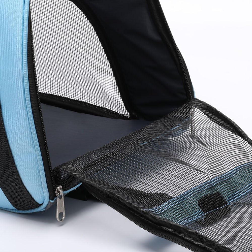• Мрежестите панели позволяват на котката да наблюдава обкръжението си в безопасността на транспортния контейнер, който има отвор от едната страна, който може да се отвори напълно, за да се улесни поставянето на домашния любимец. От другата страна на чантата има друг цип.