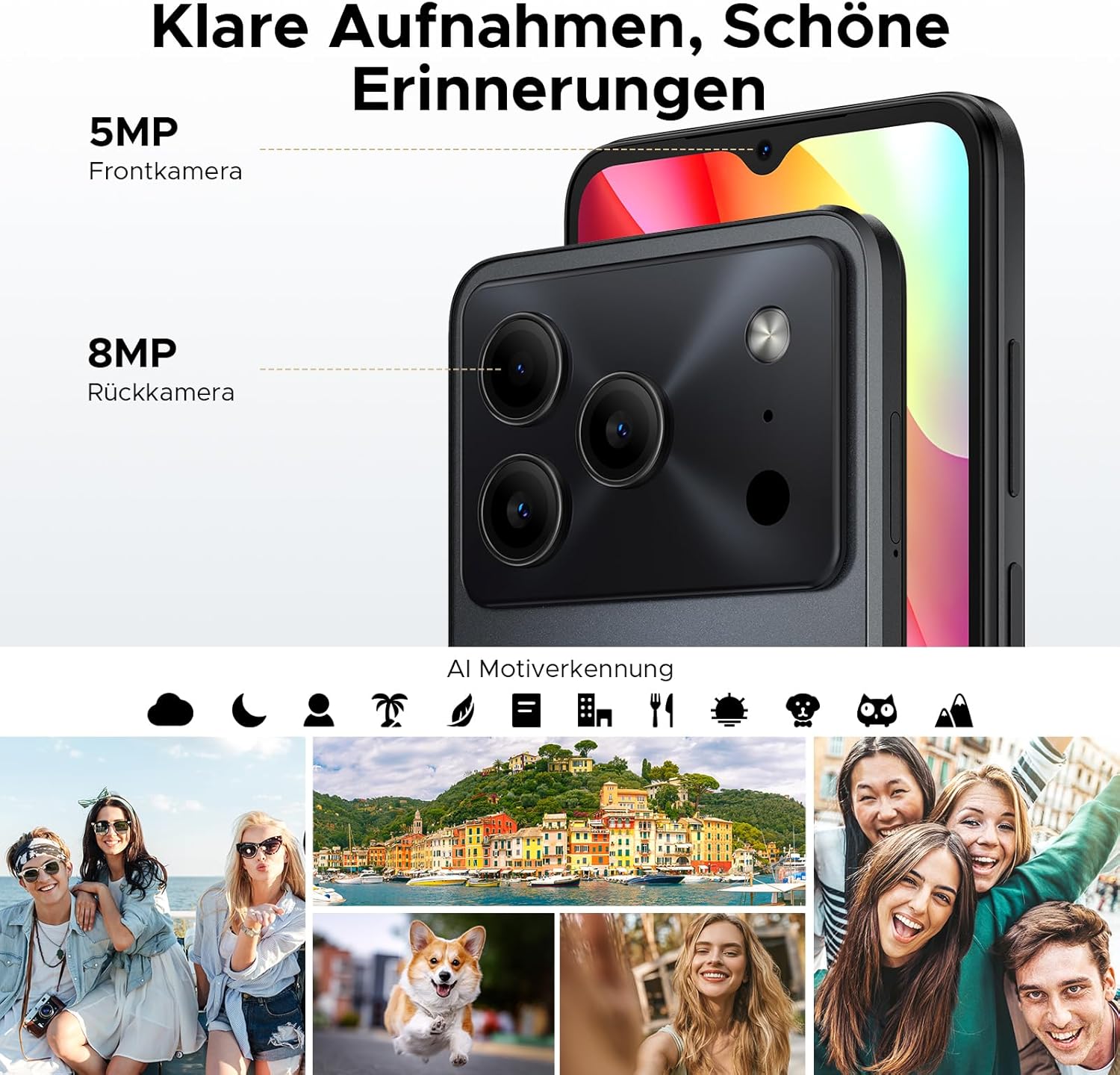 • 24 GB RAM + 64 GB ROM / 2 TB TF: Мобилният телефон DOOGEE Note 56 без договор е оборудван с 24 GB RAM (3 GB + 21 GB) + 64 GB ROM, паметта може да бъде разширена до 2 TB, можете да изтегляте много големи файлове и игри, така че не е нужно да се притеснявате за проблеми със съхранението. В същото време, смартфонът с Android 16 има 8MP основна камера и 5MP предна камера, които правят ясни снимки за ежедневни нужди.