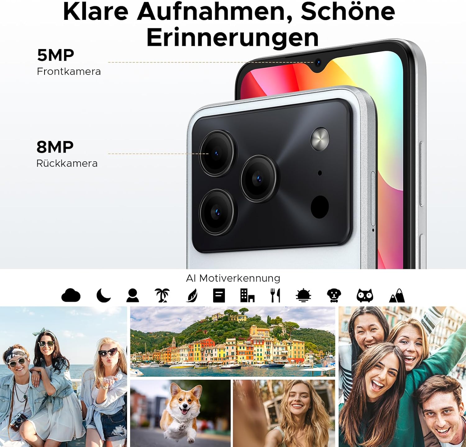 • 24 GB RAM + 64 GB ROM / 2 TB TF: Мобилният телефон DOOGEE Note 56 без договор е оборудван с 24 GB RAM (3 GB + 21 GB) + 64 GB ROM, паметта може да бъде разширена до 2 TB, можете да изтегляте много големи файлове и игри, така че не е нужно да се притеснявате за проблеми със съхранението. В същото време, смартфонът с Android 16 има 8MP основна камера и 5MP предна камера, които правят ясни снимки за ежедневни нужди.