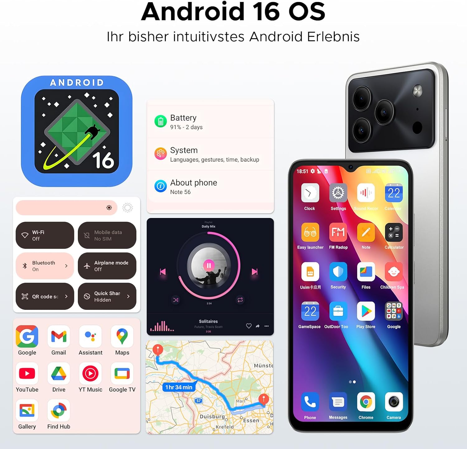 • Android 16 + Octa Core: Смартфонът DOOGEE Note 56 с Android 16 без договор разполага с най-новата система Android 16, която е значително актуализирана по отношение на сигурност, поверителност и производителност. Чувствителните данни са криптирани и се съхраняват независимо, скоростта на стартиране на приложението е увеличена с 20%, скоростта на превключване при многозадачност е значително оптимизирана, а приложението работи по-плавно, оборудвано с Octa Core чип.
